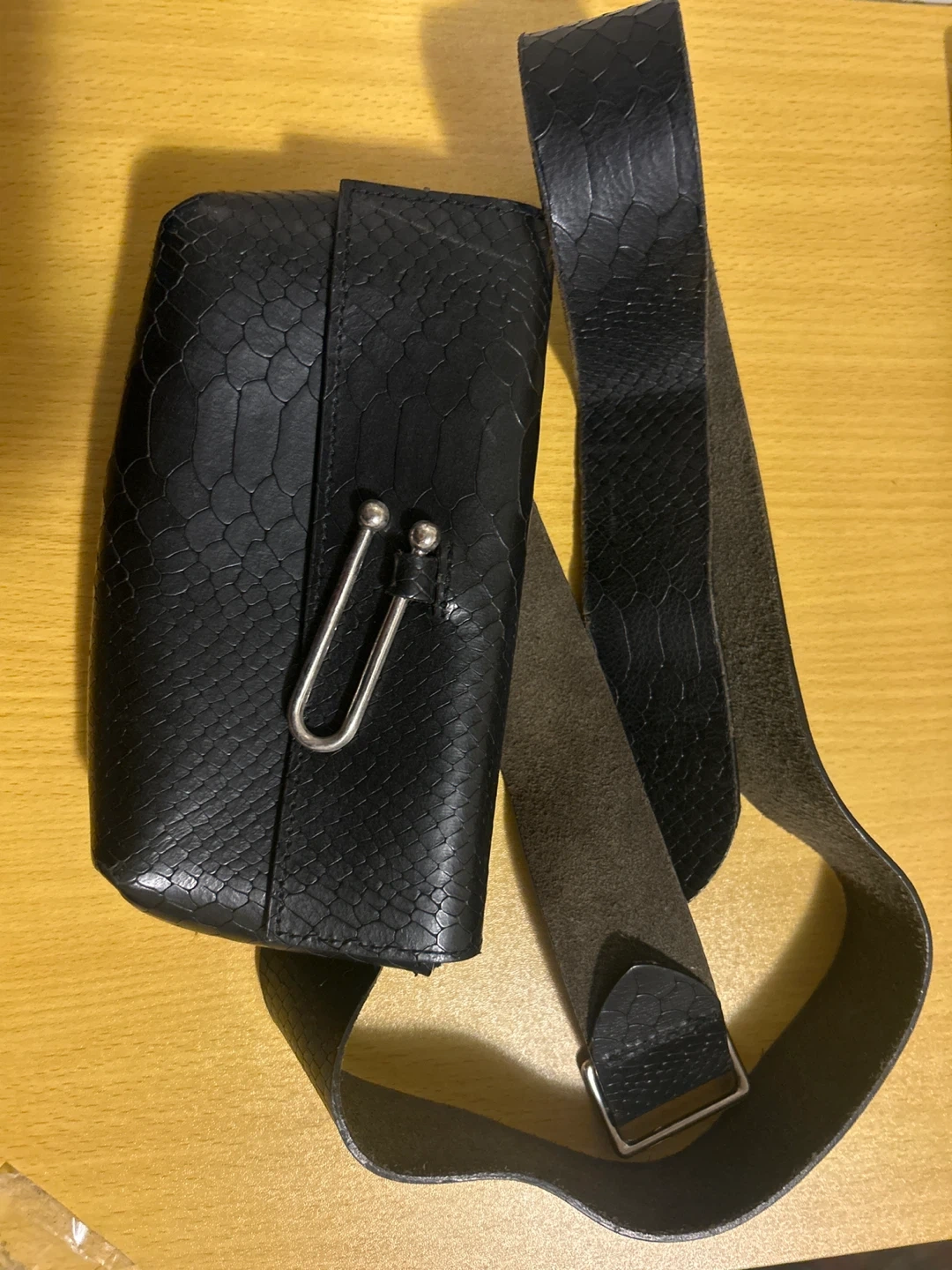 This black belt bag has a faux snakeskin texture. It's a compact size with an adjustable strap and metal hardware. This bag would be useful for carrying essentials when you're on the go.