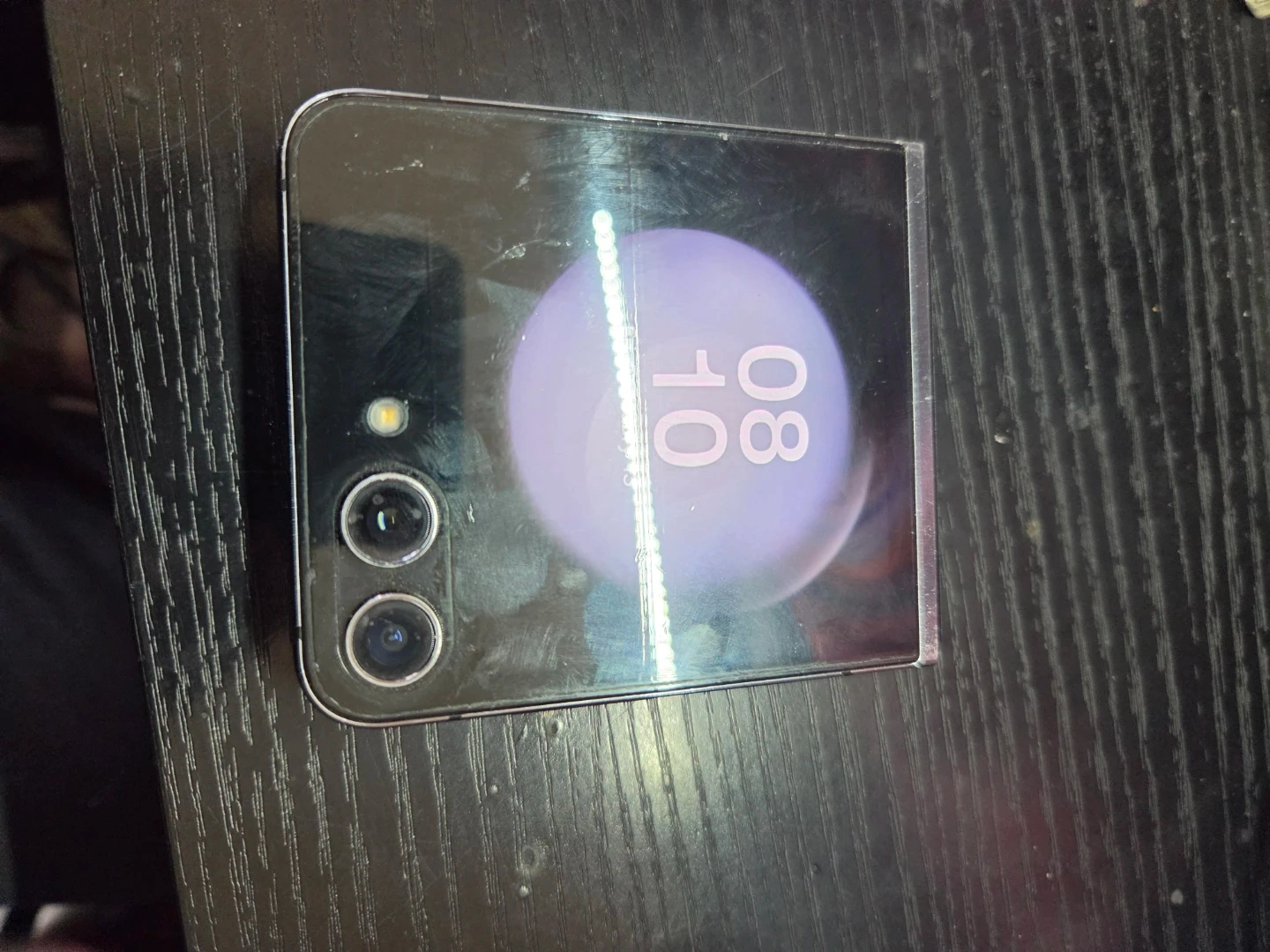 It's a Samsung Galaxy Z Flip 5 cell phone. The screen is a foldable dynamic AMOLED 2X display. It's black and has a dual-camera system. This phone would be useful for anyone wanting a compact smartphone!