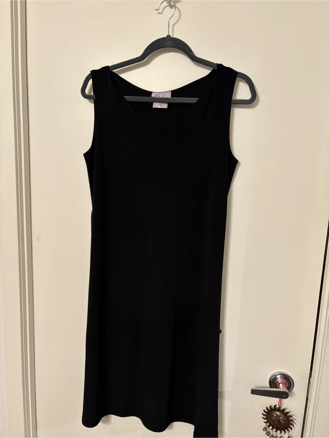This is a simple black sleeveless dress. It's a comfortable basic for any wardrobe. This dress would be useful for layering or wearing on its own.