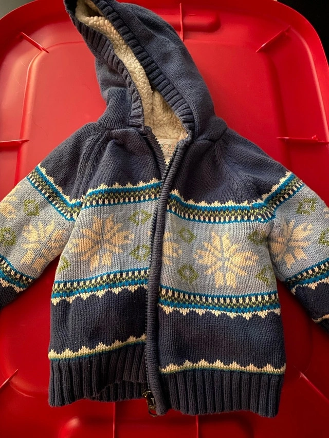 Keep your little one cozy with this adorable Cherokee baby sweater, designed for 3-6 month olds! This charming blue knit sweater features a snowflake pattern and a warm, sherpa-lined hood. It’s in good condition, ready for its next adventure. Brand: Cherokee, Size: 3-6 months, Colour: Blue, Material: Knit with sherpa-lined hood. This sweater is so cute, it practically begs for a spot in your little one's wardrobe. If you see this ad, it’s available and waiting for a new home! Cash accepted.