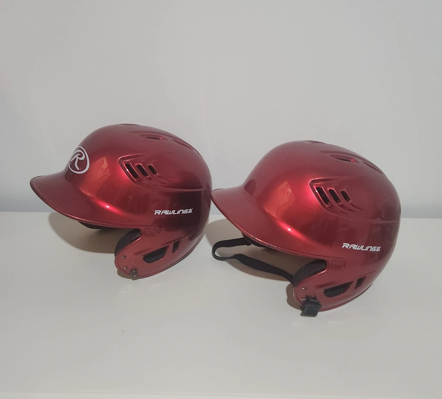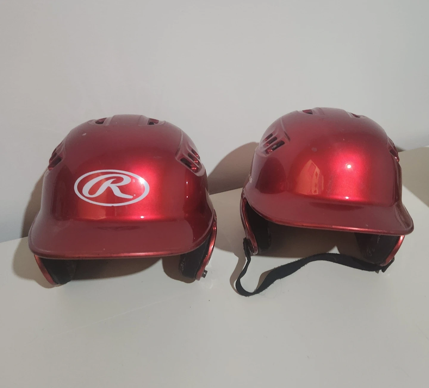 Two shiny red Rawlings baseball helmets. In great condition! Used 2 years.They offer protection and feature a classic design.