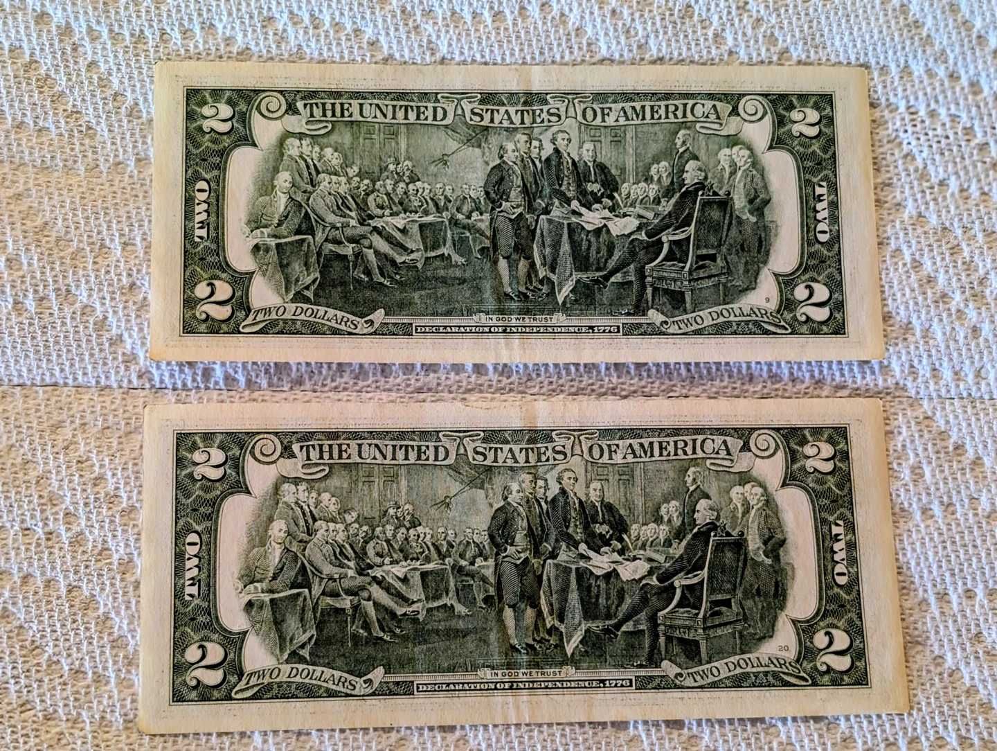 Serial Numbers: The bills have sequential serial numbers F04984023A and F04984024A