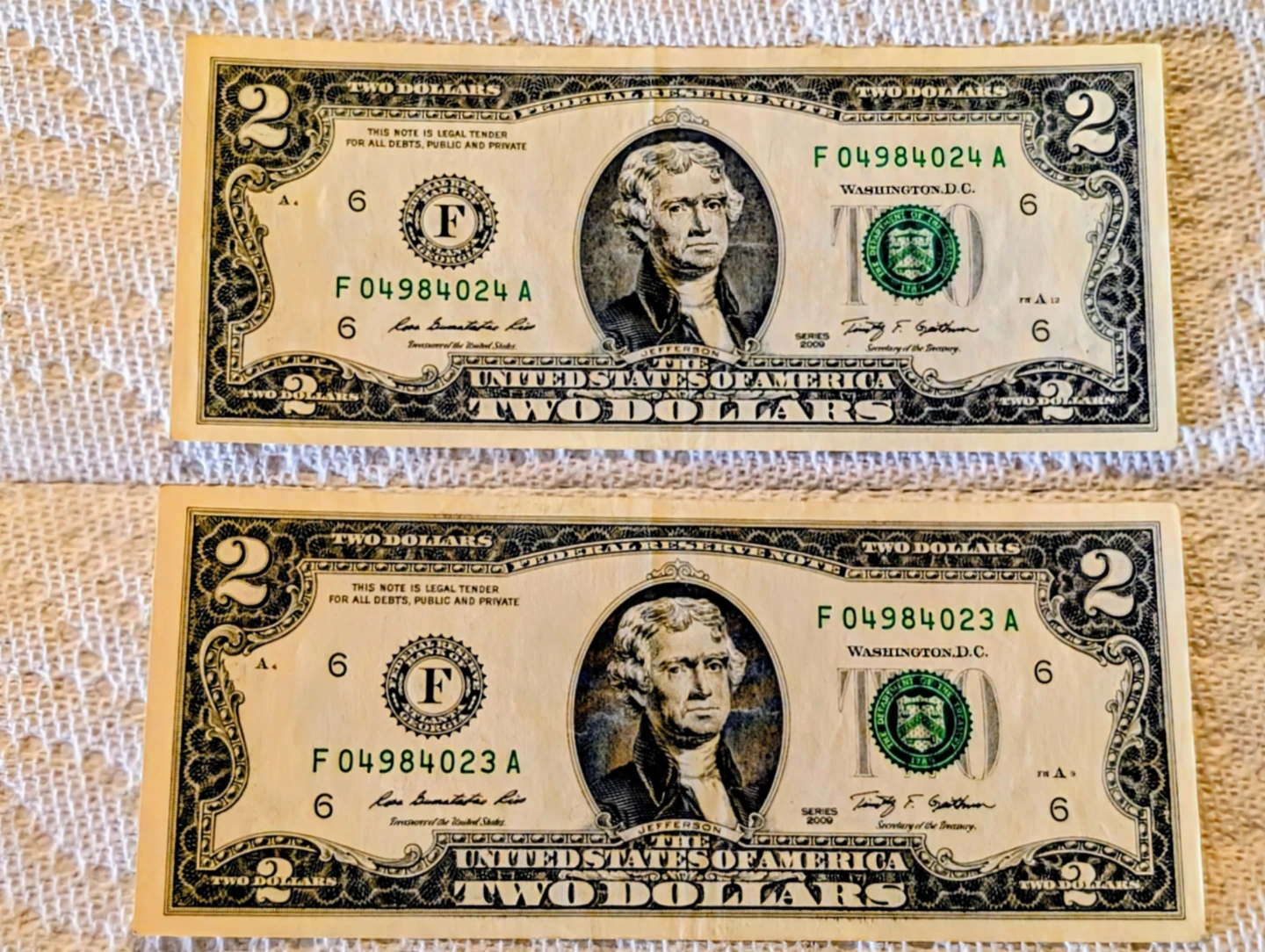 Serial Numbers: The bills have sequential serial numbers F04984023A and F04984024A