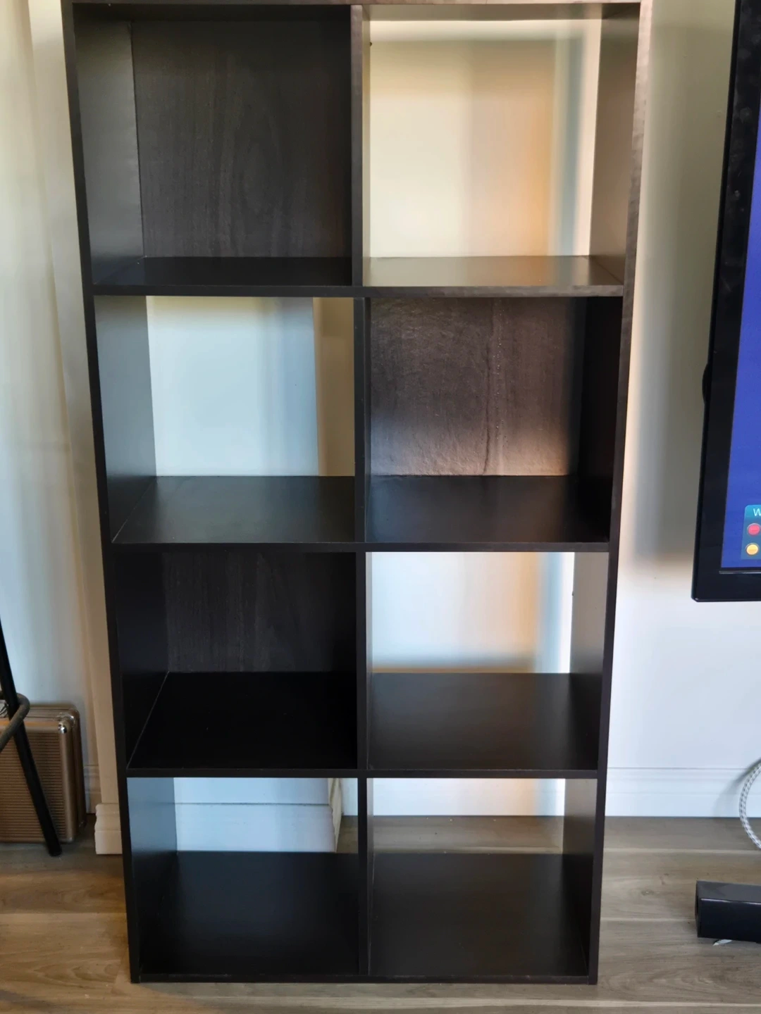 We have 2 8-cube storage shelves in a dark wood finish. They are versatile units that can hold books, decor, or general storage. The open-back design allows for easy cord management.