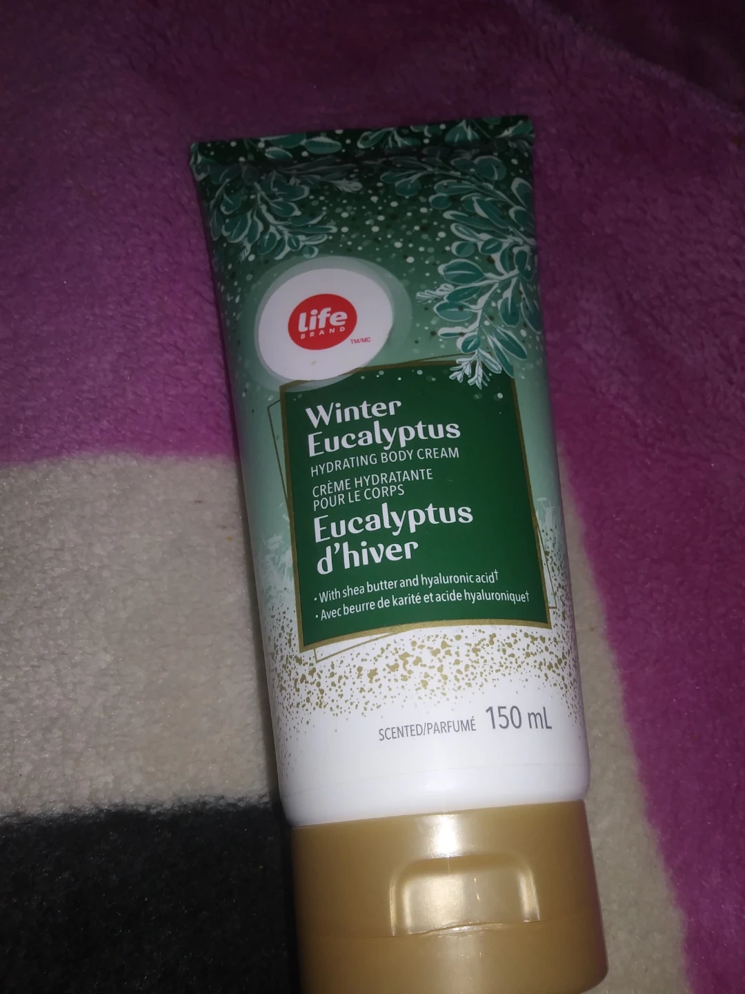 Selling a Life Brand Winter Eucalyptus hydrating body cream! It's a scented cream that comes in a 150 mL bottle, perfect for keeping your skin moisturized during the winter months. It's formulated with shea butter and hyaluronic acid to help keep your skin feeling soft and hydrated