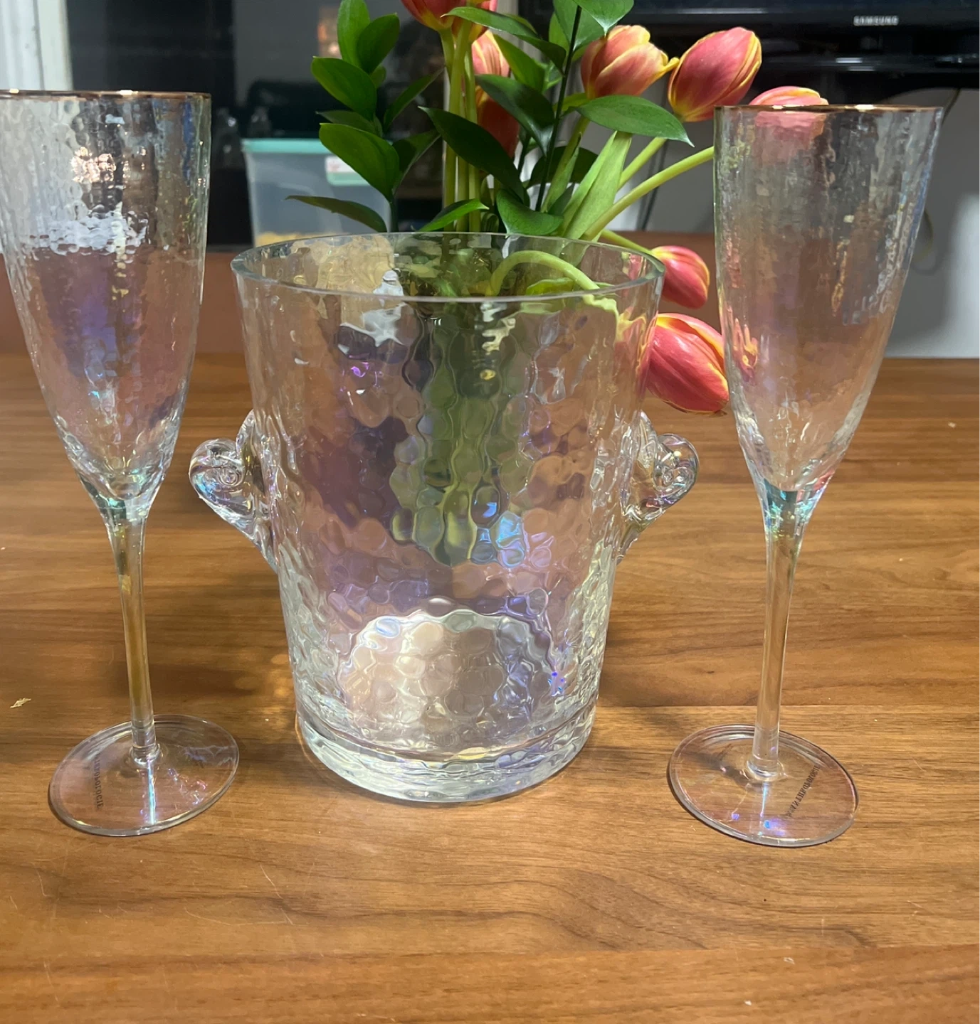 Selling a set of Waterford champagne flutes and an ice bucket. These are in great condition and would be perfect for entertaining! The glasses have a beautiful iridescent shimmer to them.
