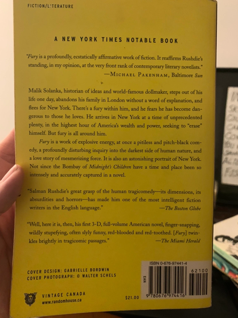 Salman Rushdie “Fury” paperback in good- excellent condition. Pick up in Roncesvalles. Same Day/Next Day pick up preferred.