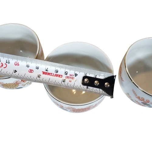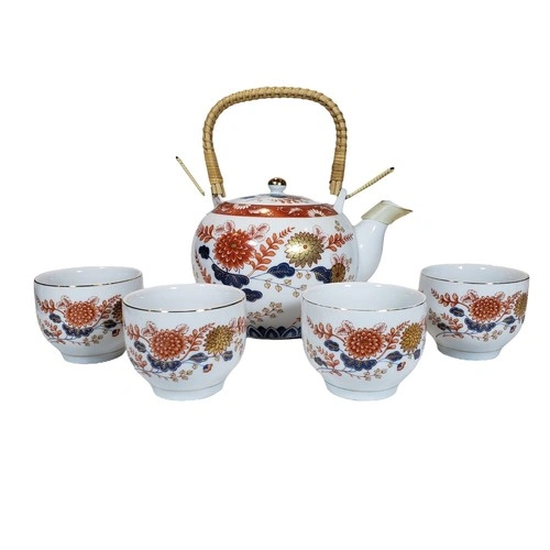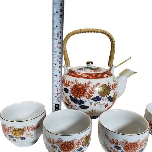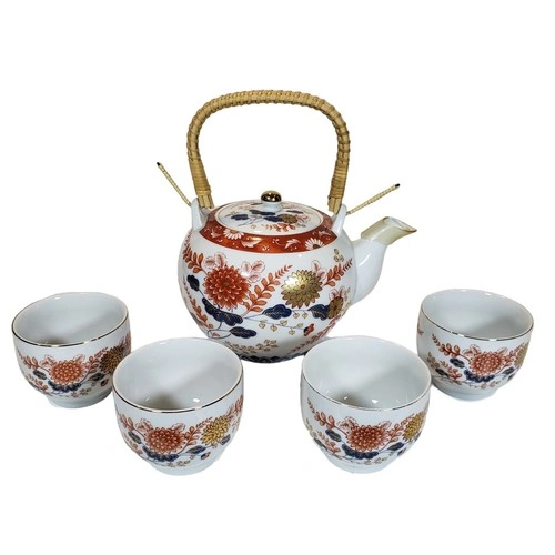 This vintage Japanese porcelain tea set includes a teapot with a wicker handle and 4 cups. It has been stored in a display cabinet and never used.