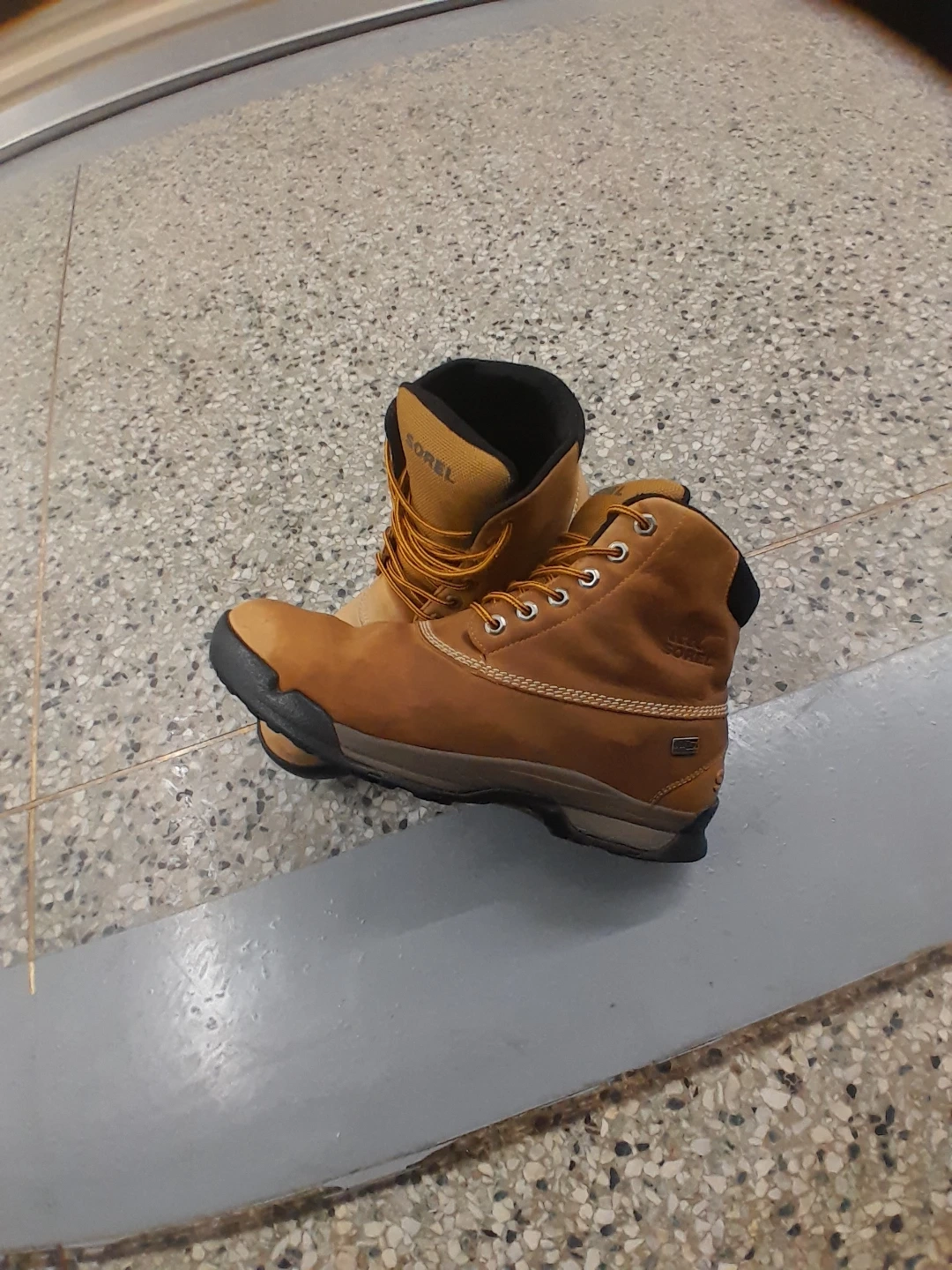 Sorel waterproof boots in a tan colour. Lace-up closure. Rugged soles for good grip. These boots are built to last! Men's size 12.