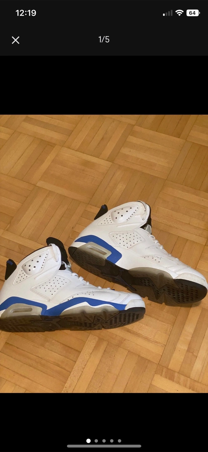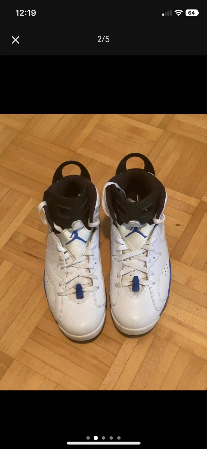 Selling a pair of Air Jordan 6 Retro in white and sport blue! They are in great condition and come with the original box. The size is US 11, EUR 45, UK 10, and CM 29. A classic pair of kicks!