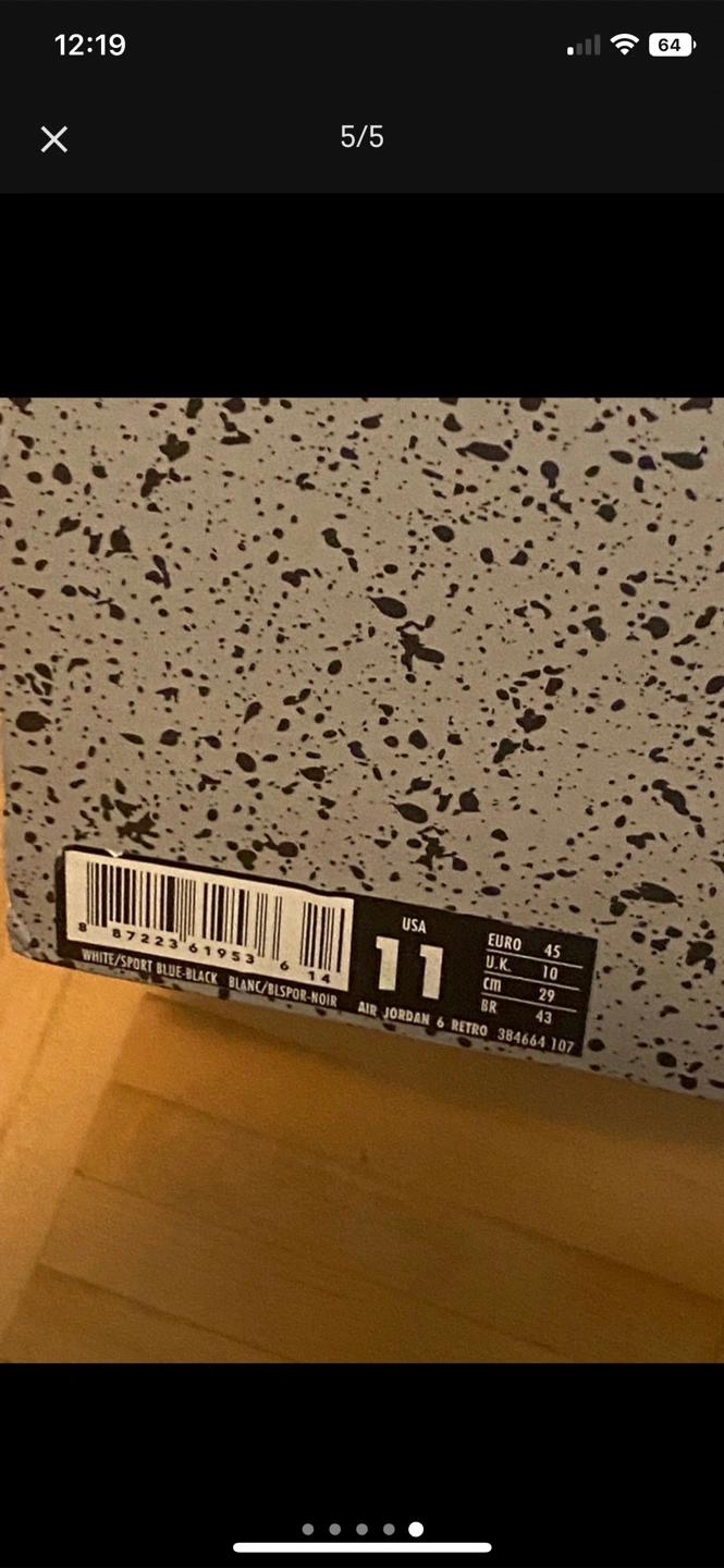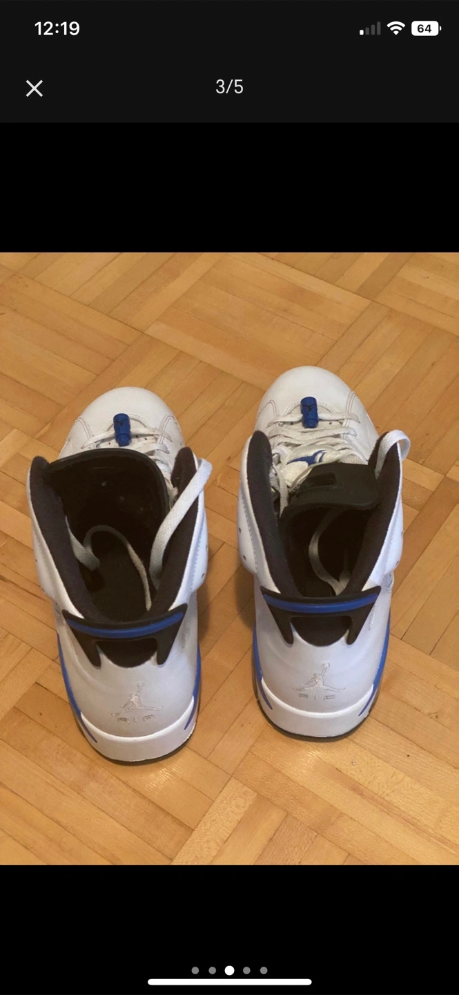 Selling a pair of Air Jordan 6 Retro in white and sport blue! They are in great condition and come with the original box. The size is US 11, EUR 45, UK 10, and CM 29. A classic pair of kicks!