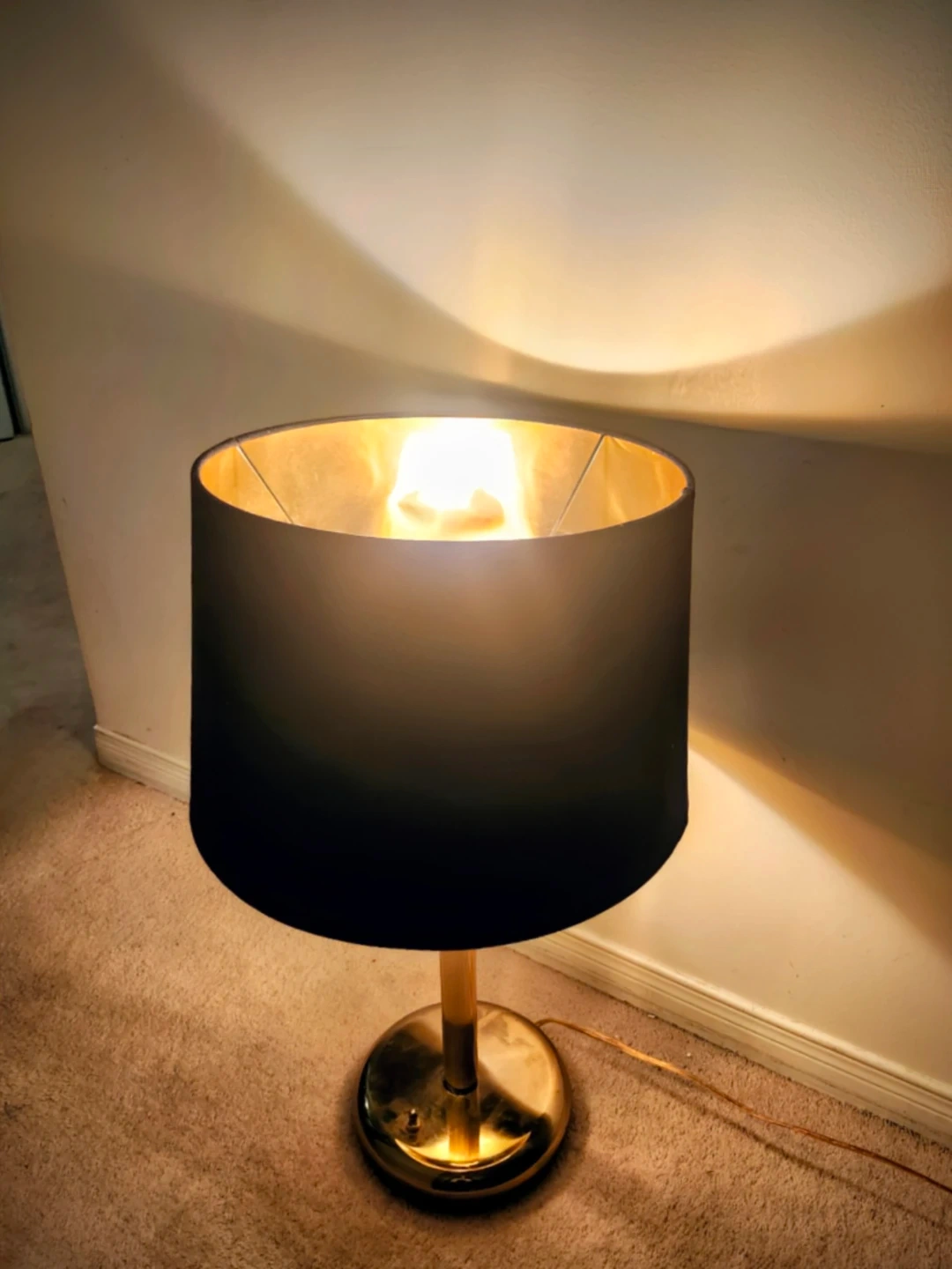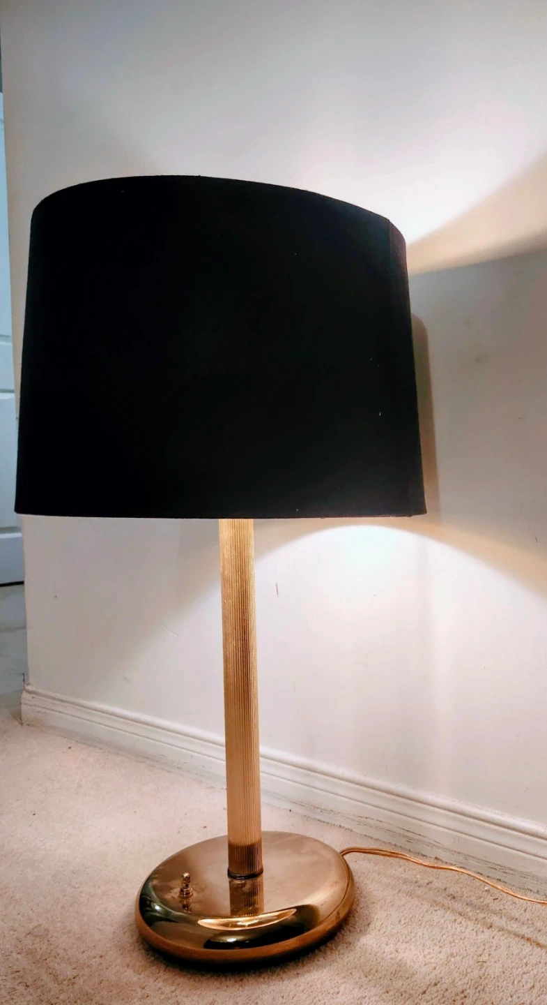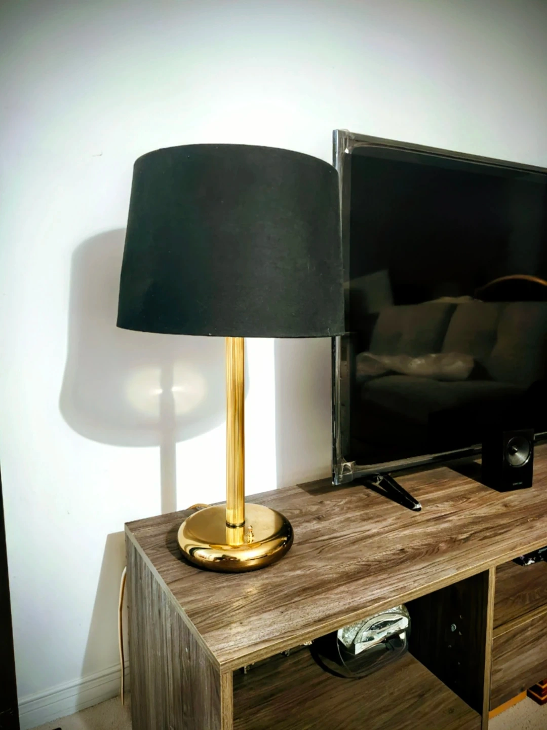 Selling a lovely accent table lamp with a black shade and gold base. It gives off a nice warm light and would look great in any room
