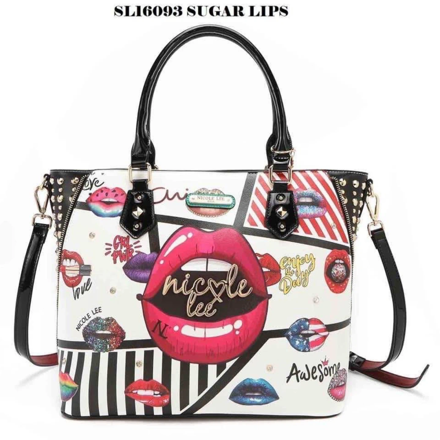 This Nicole Lee satchel handbag features a vibrant "Sugar Lips" design. It has dual top handles and an adjustable shoulder strap. The interior likely offers organized storage.