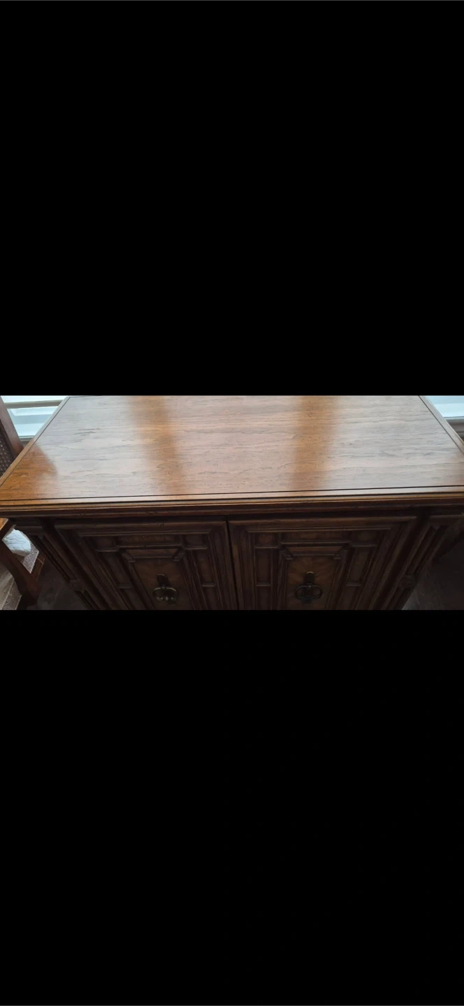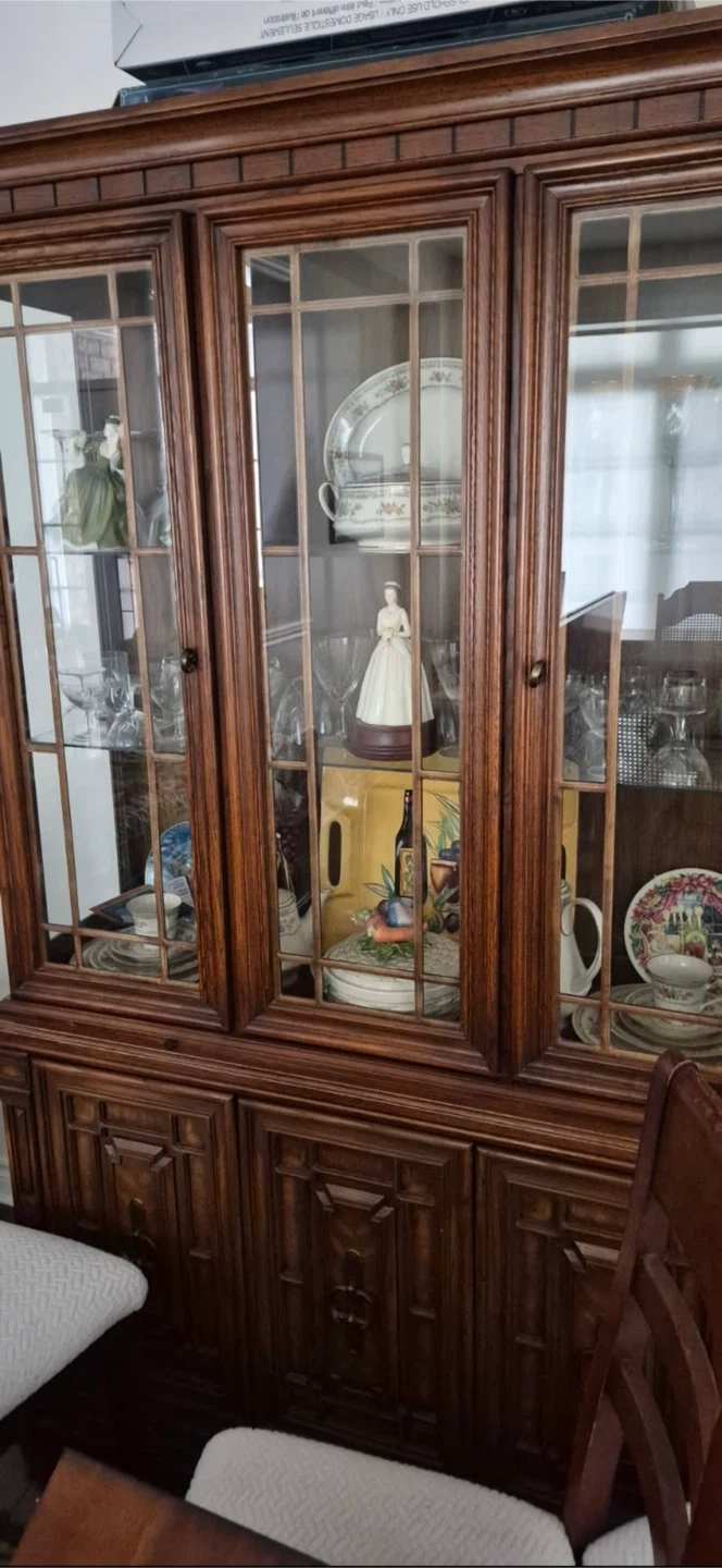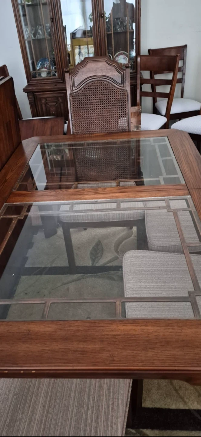 A handsome wood dining room set featuring a cane back and upholstered seats. It has elegant detailing and would complement a traditional dining set. Its sturdy construction ensures lasting use. Comes with the table and 2 leaves, 6 chairs, hutch and buffet server. Excellent condition. Moving sale. Make an offer.