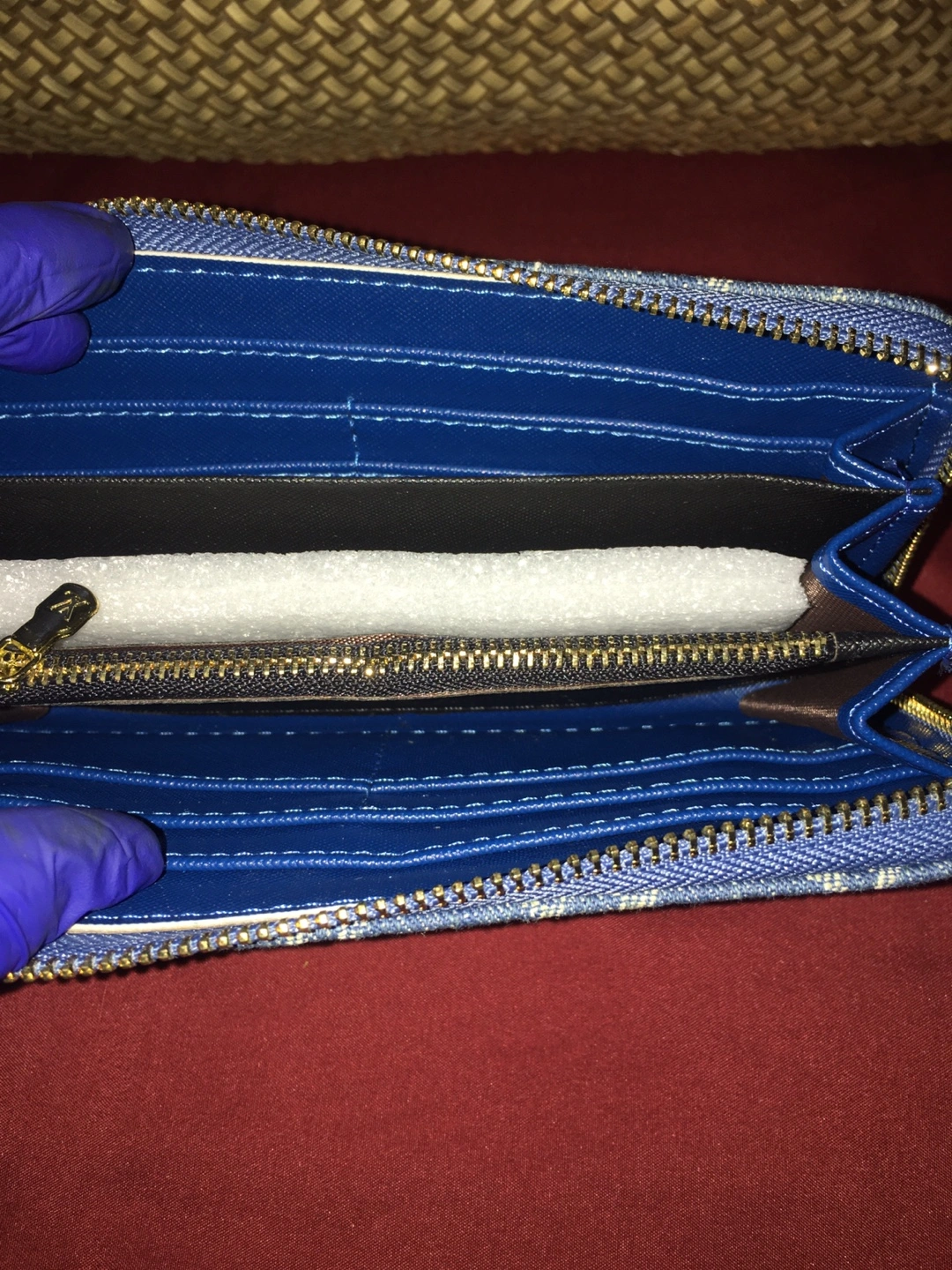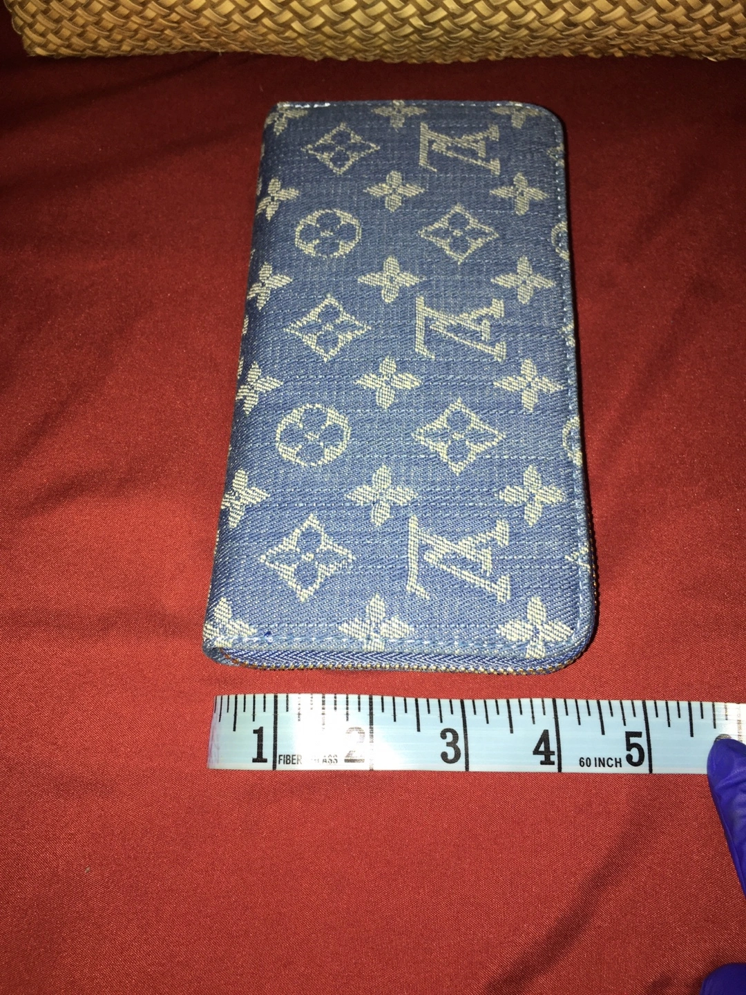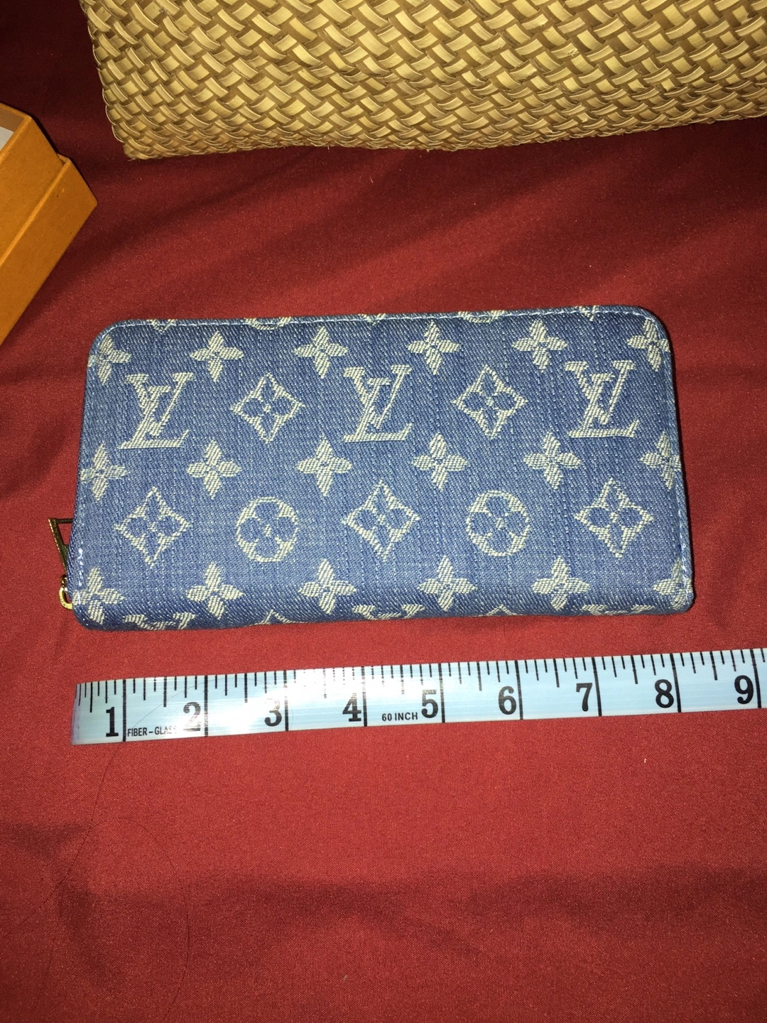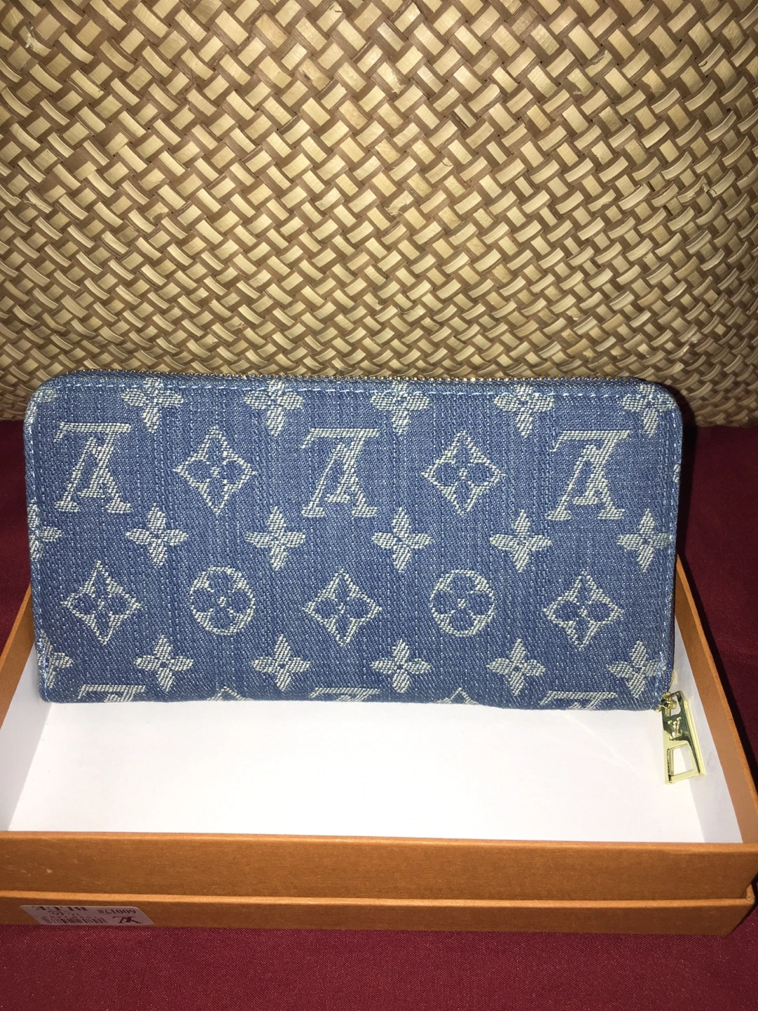 Louis Vuitton zipped wallet in blue denim with signature monogram pattern. Includes original Louis Vuitton box. A stylish accessory for everyday use!