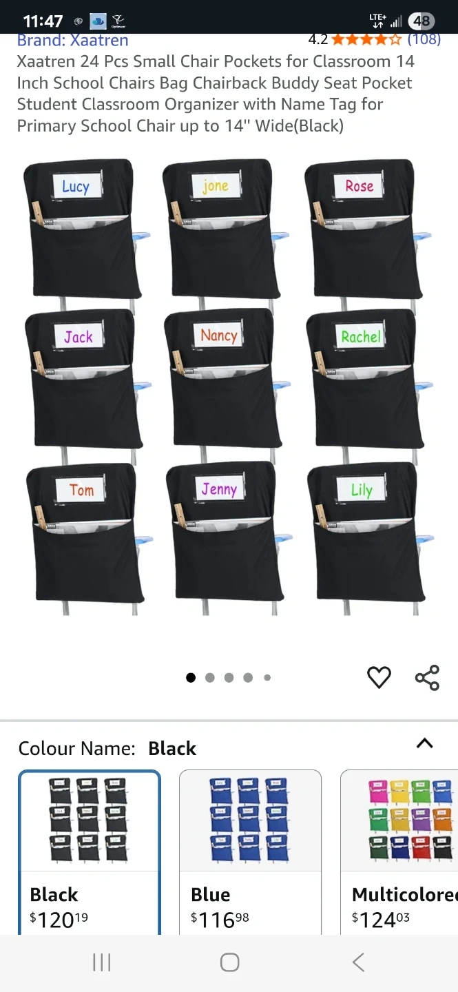 These black chair pockets are designed for classroom use, fitting primary school chairs up to 14 inches wide. They include name tags and offer handy storage. Great for keeping classroom supplies organized! Includes 24 chair covers and name tags