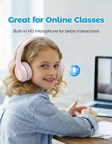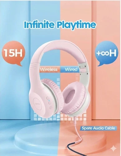 Mpow CH6 Plus Kids Bluetooth Headphones with Microphone (Pink), Model BH441A. Connect wirelessly via Bluetooth 5.0 for hassle-free listening up to 33ft. Enjoy up to 15 hours of playtime on a single charge, or plug in the audio cable for continuous music. Custom-tuned 40mm drivers deliver Hi-Fi stereo sound with a built-in volume limiter (max 94dB) for safe listening. Designed for comfort with plush memory foam earpads and an adjustable headband, these foldable headphones fit toddlers to teens. Easy controls on the earcup are perfect for online classes and movies. Let me know if you're interested!