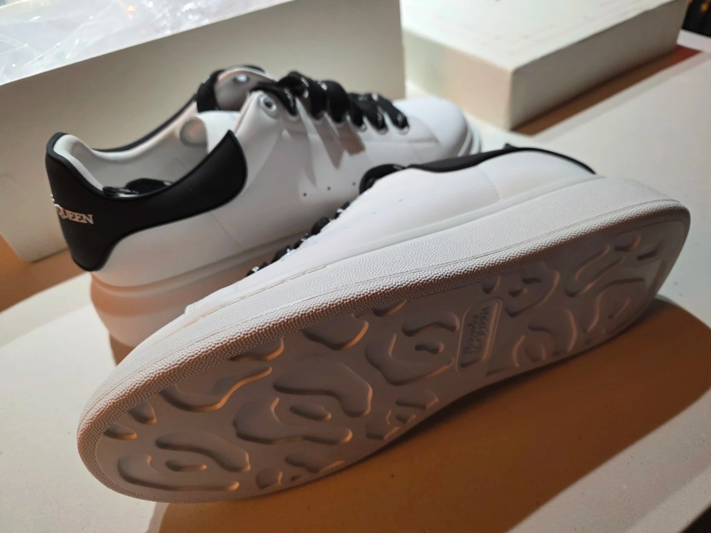 Classic Alexander McQueen oversized sneakers in white leather with black accents. These sneakers feature a distinctive chunky sole and come with extra black laces. Original box and shoe bag included.
