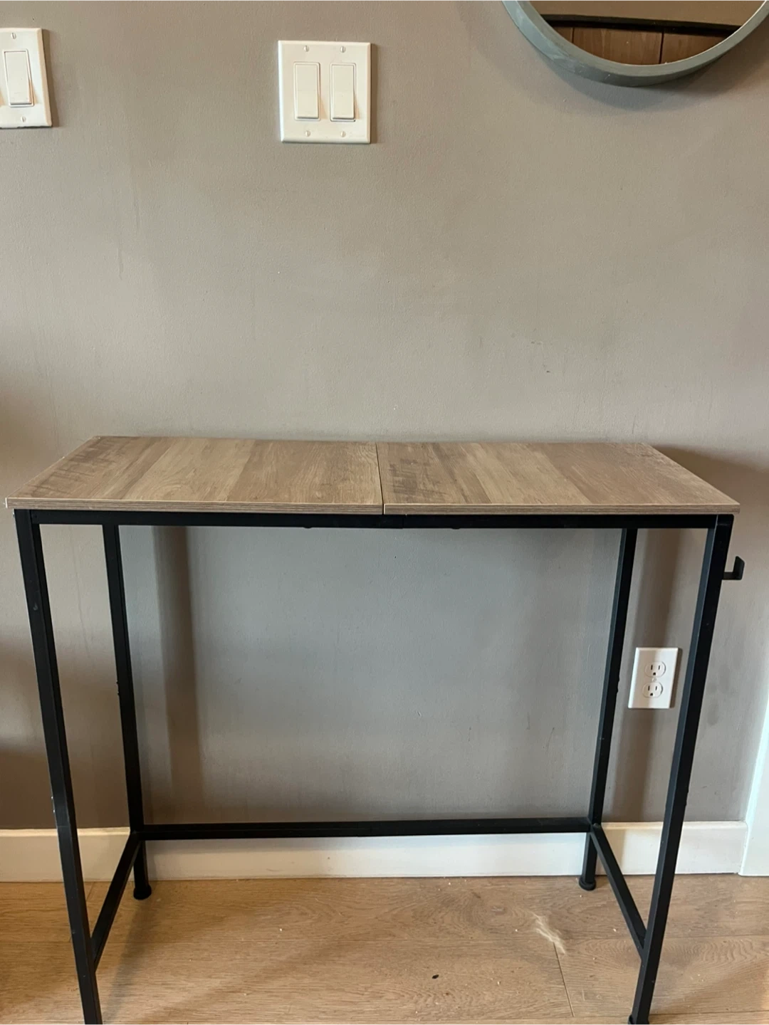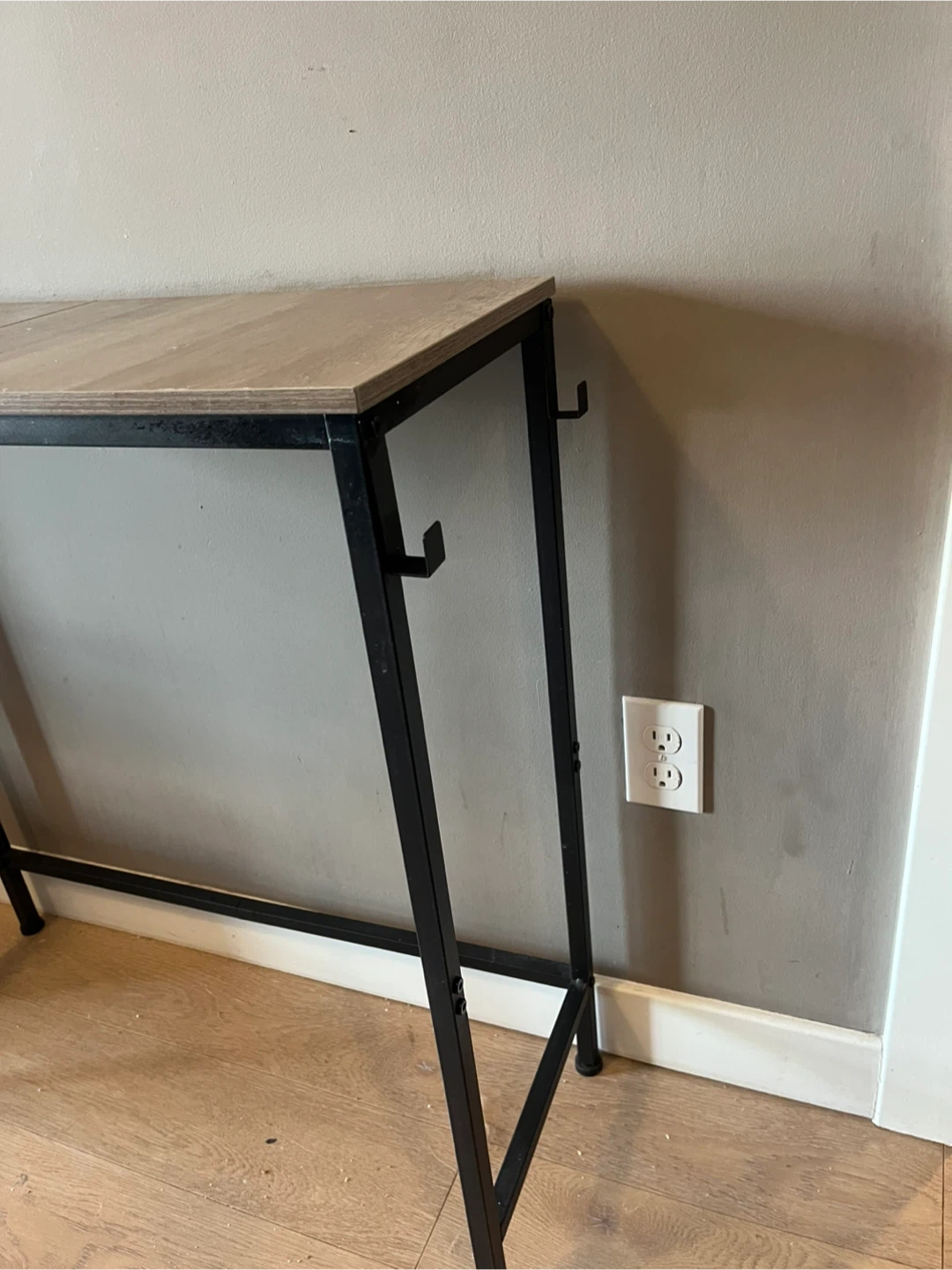This slim entrance table features a light wood-look top and a black metal frame. It has two built-in hooks on the side. Perfect for entryways or narrow spaces! Pick up only. $40 OBO