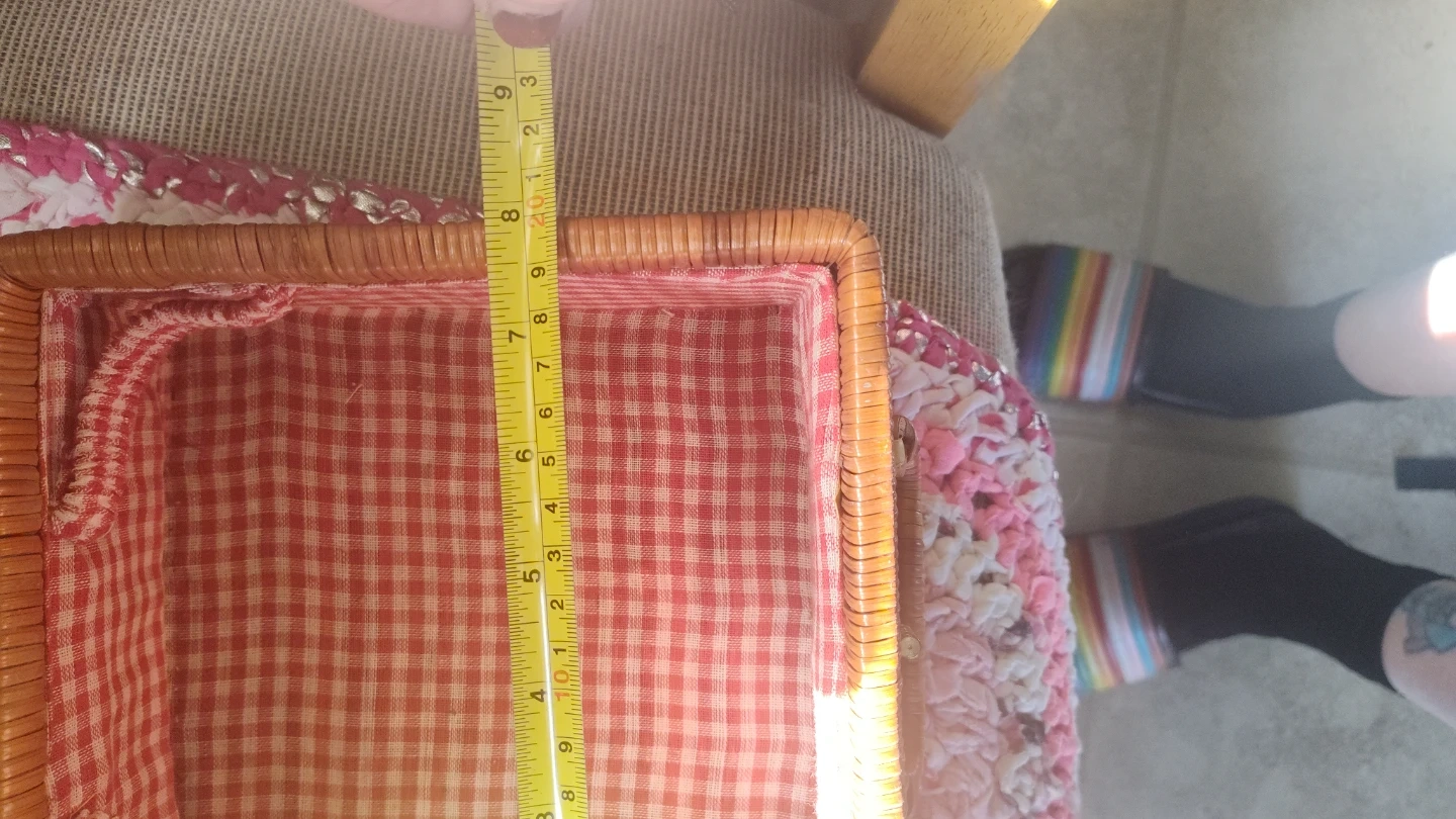 This is a charming wicker picnic basket, perfect for your outdoor adventures. It features a classic woven design and a sweet red gingham fabric lining inside. The basket measures approximately 6 inches tall and 9 wide.