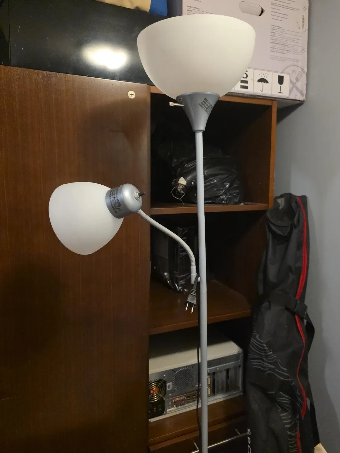This floor lamp has a main overhead light and a flexible reading light. The main lamp shade is white and the pole is grey. It's a good addition to any room for extra lighting. Apox 6 ft tall