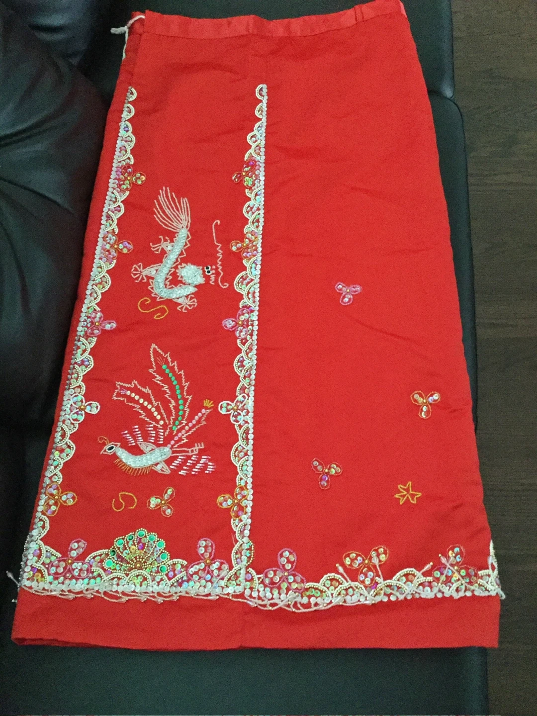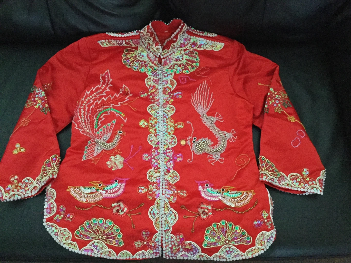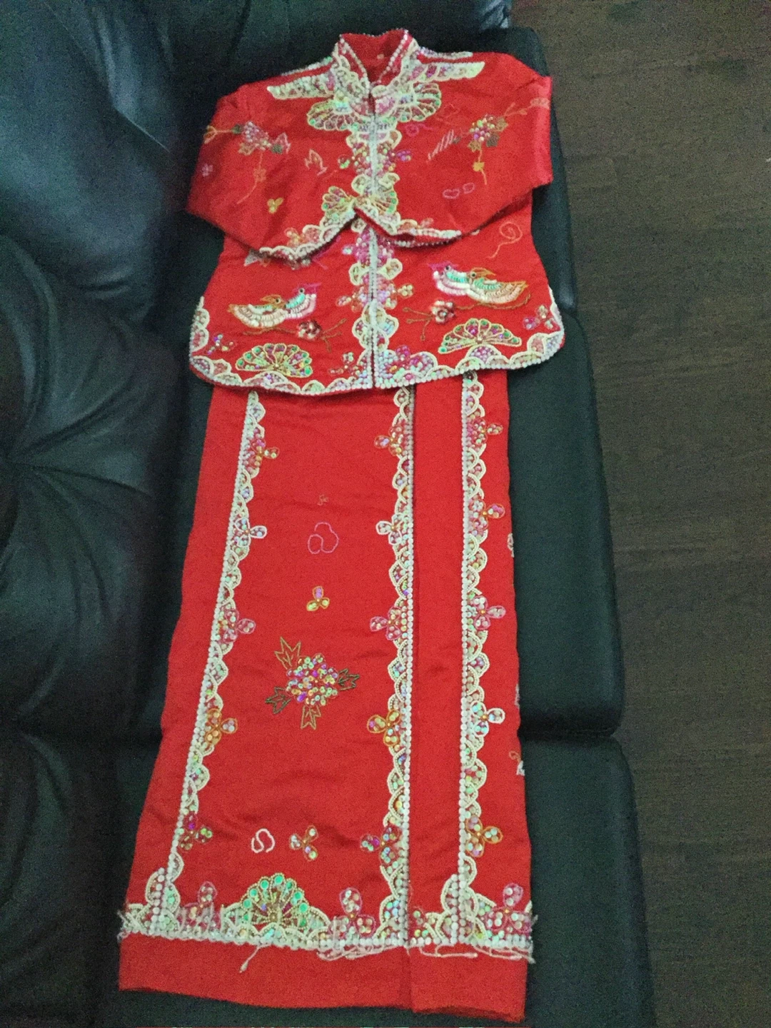 This is a two-piece red embroidered Chinese wedding outfit. It features intricate dragon and phoenix designs with colourful beadwork along the edges and collar. The top is a long-sleeved jacket and the bottom is a matching skirt. The fabric appears to be silk or a silk blend. This outfit is perfect for cultural events or traditional ceremonies.