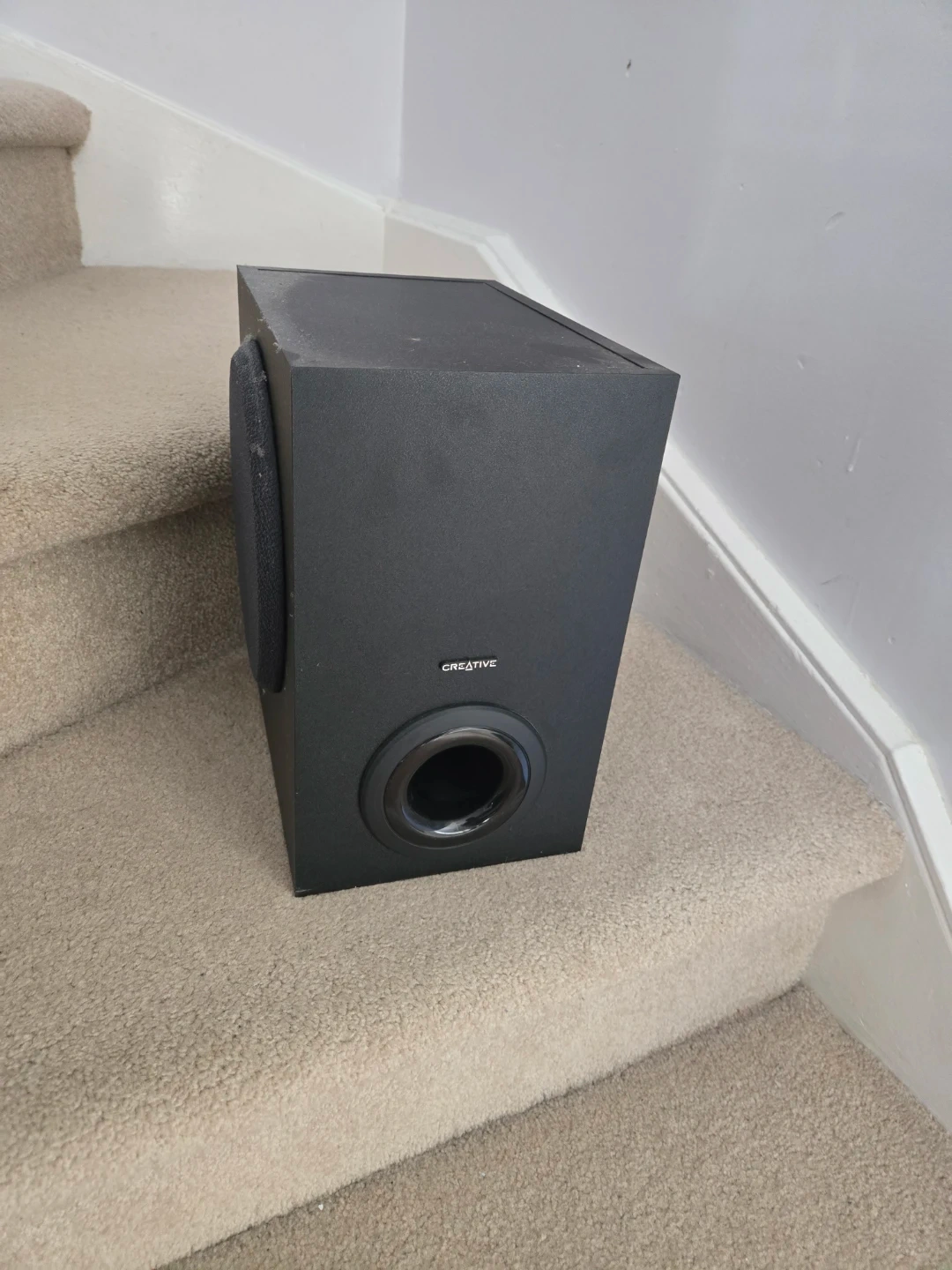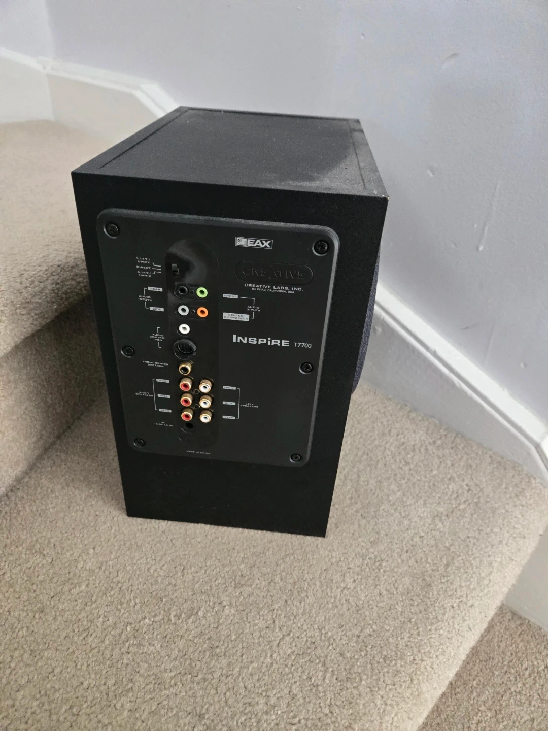 Creative Inspire T7700 subwoofer for sale. This powered subwoofer enhances audio output for a more immersive sound experience. It features various audio input and output ports on the back panel for connectivity.