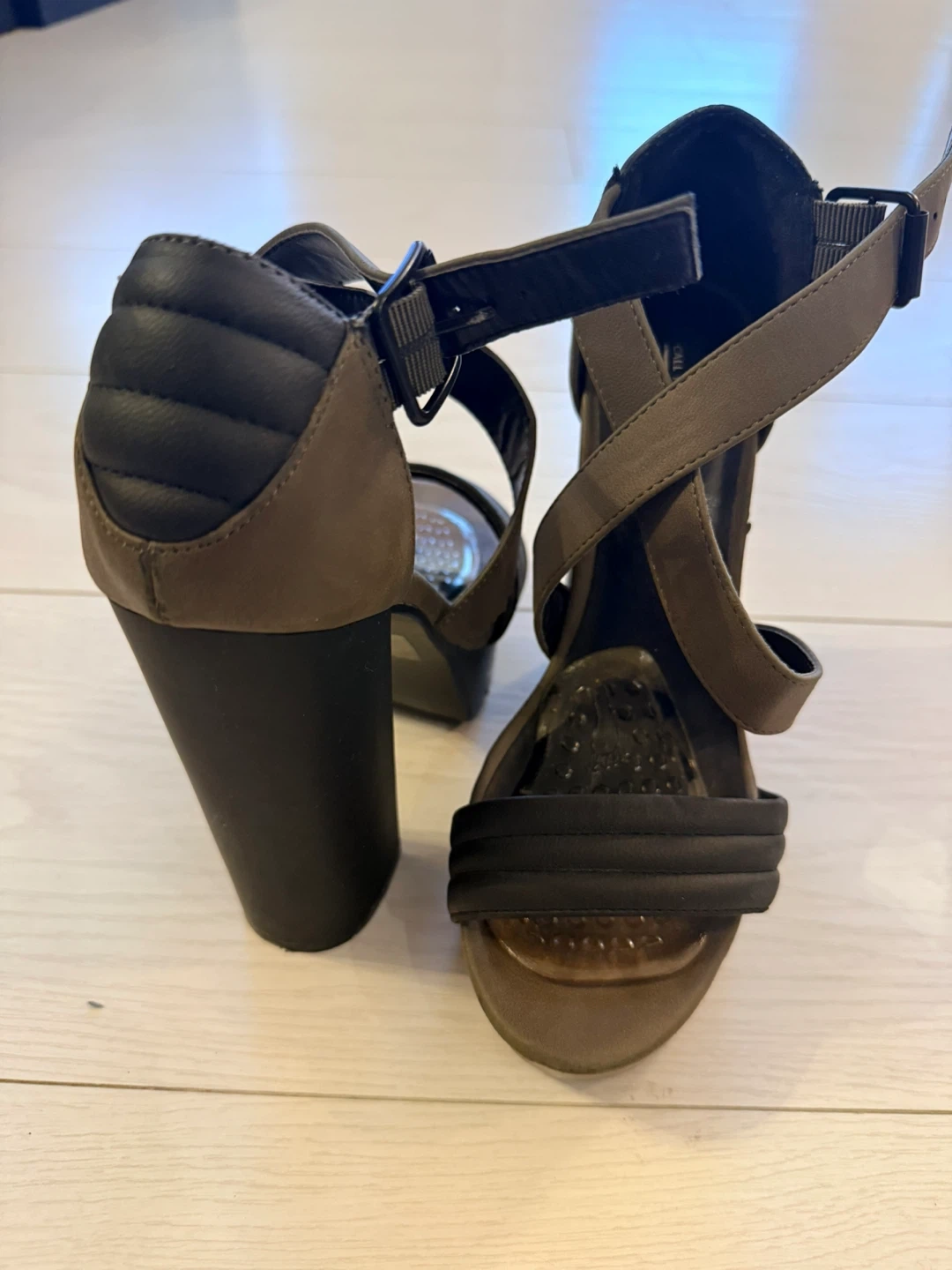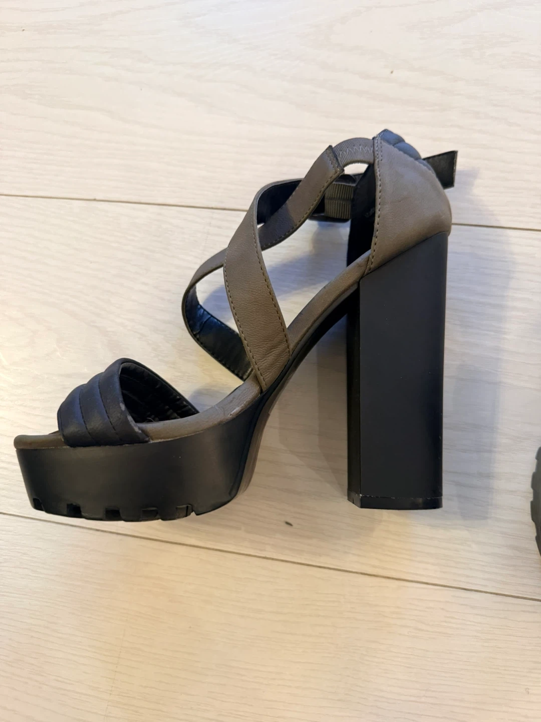 Stylish army green and black strappy platform sandals with a block heel. Size 7 (US), 37.5 (EUR). Perfect for dressing up an outfit!