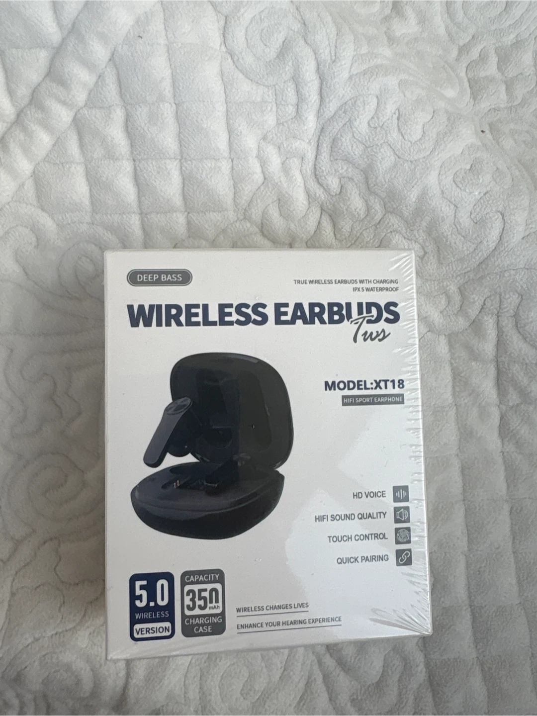 Selling a brand new pair of Wireless Earbuds TWS, Model XT18! These earbuds feature deep bass and are IPX5 waterproof. They also have HD voice, HIFI sound quality, touch control, and quick pairing. The charging case has a 350mAh capacity and the wireless version is 5.0