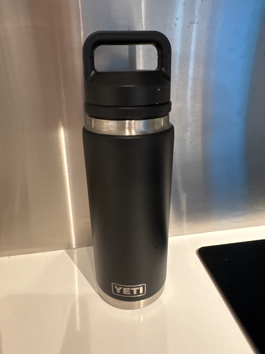 This is a Yeti insulated water bottle in black. It's made of durable material and features a convenient carry handle. Keep your drinks hot or cold for hours!