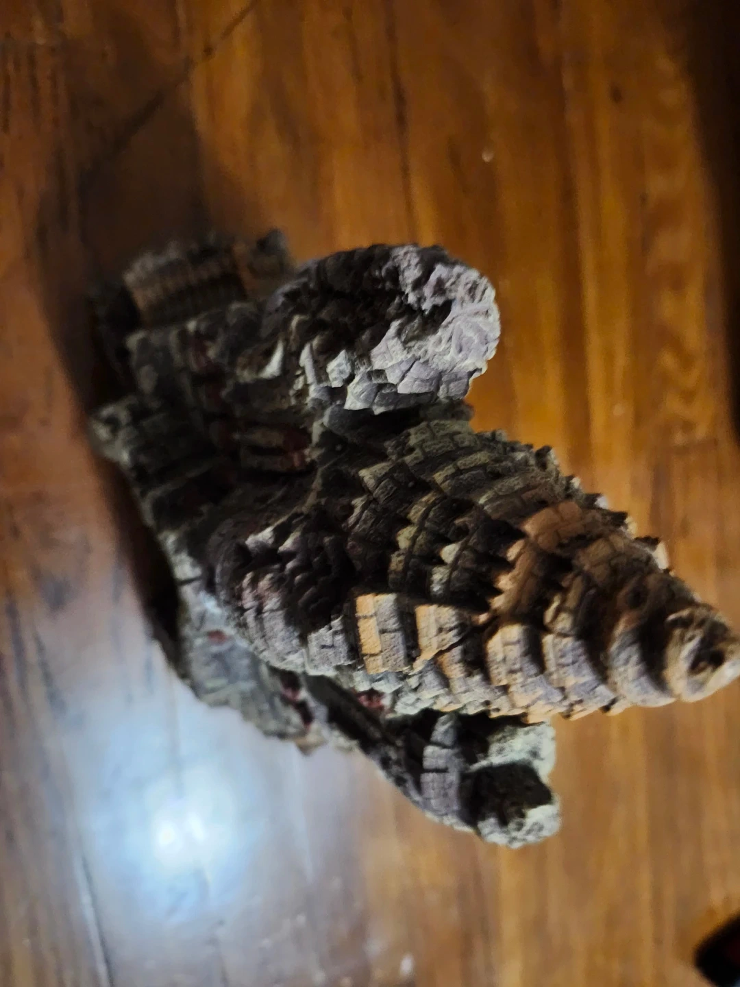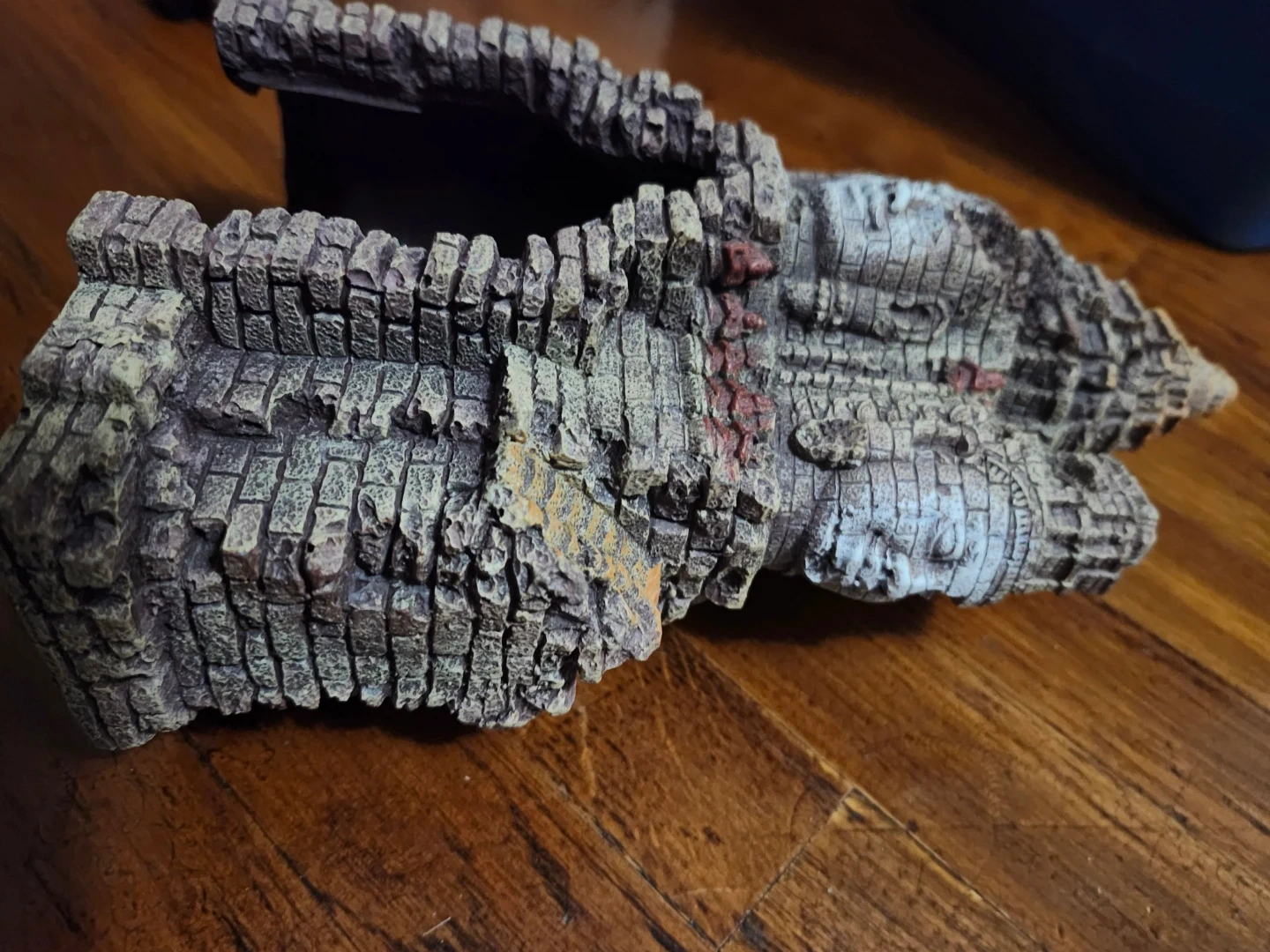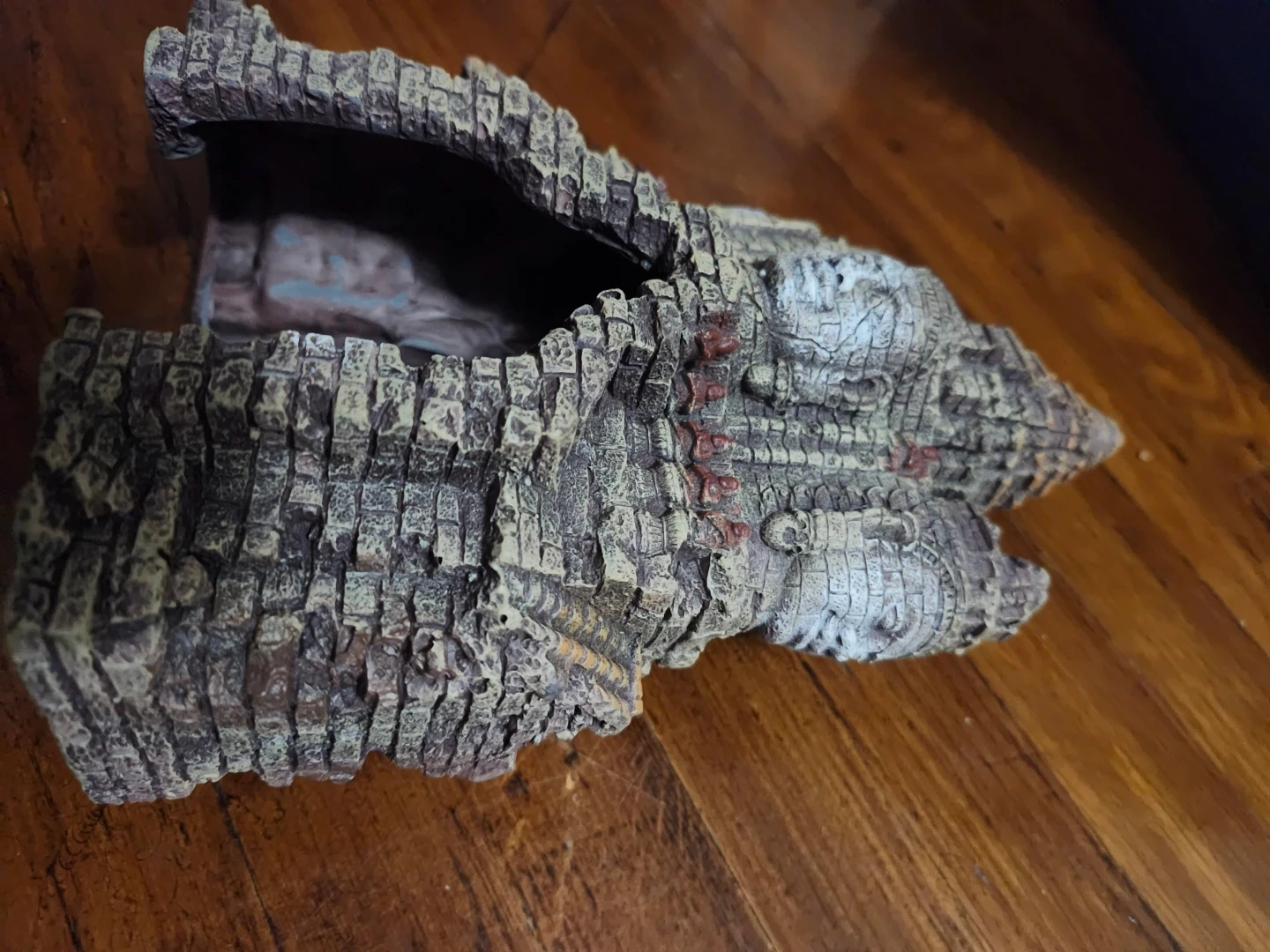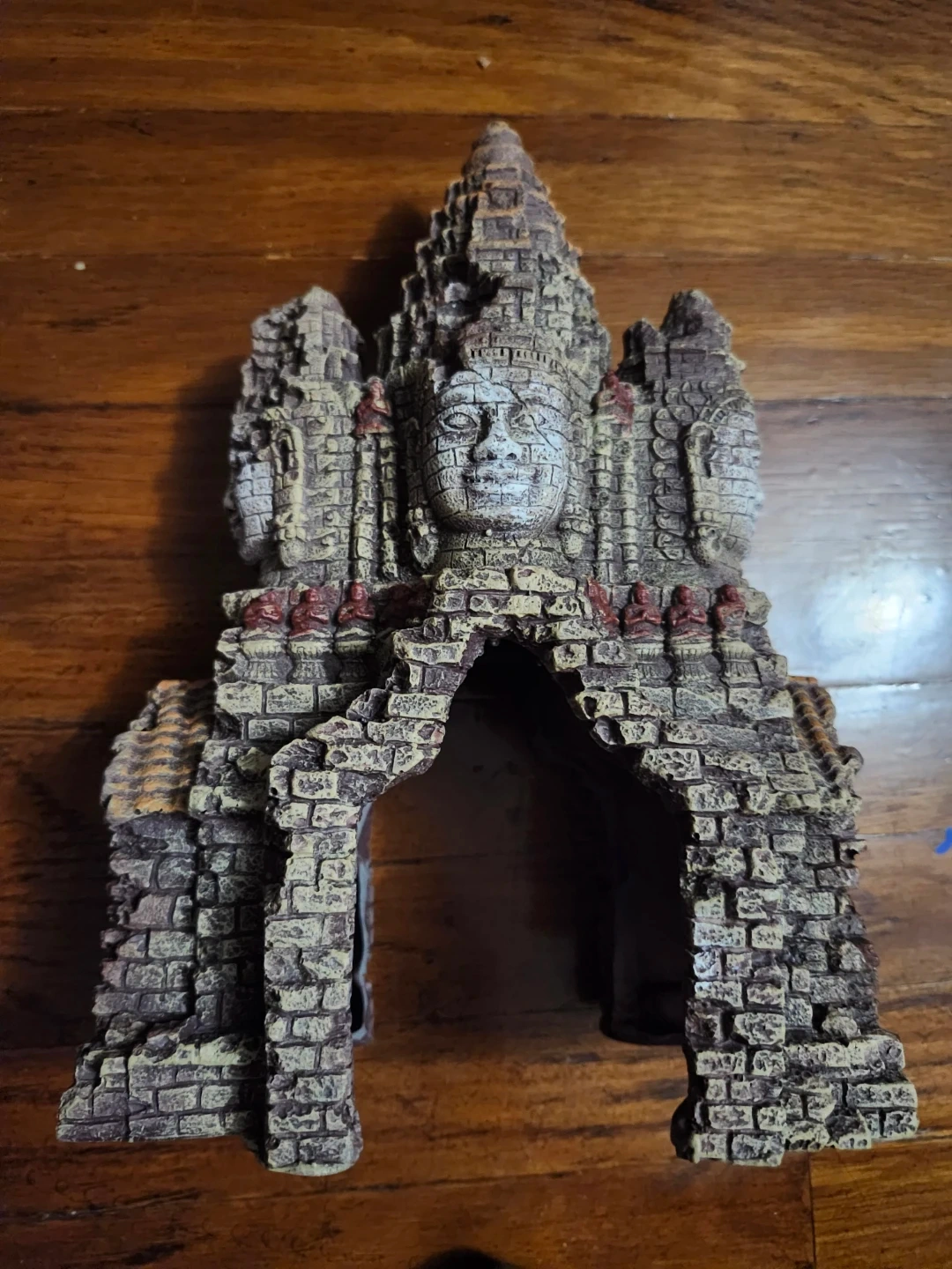 This aquarium decoration features an ancient temple design with multiple faces. It's made of resin and provides a hiding place for fish. Adds a unique aesthetic to your tank!