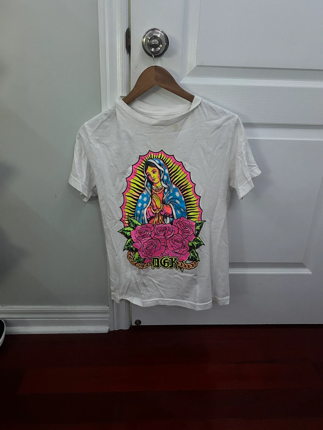 Selling a white DGK skater t-shirt with a colourful graphic design. It features an image of the Virgin Mary surrounded by roses. Perfect for adding a pop of colour to your wardrobe!