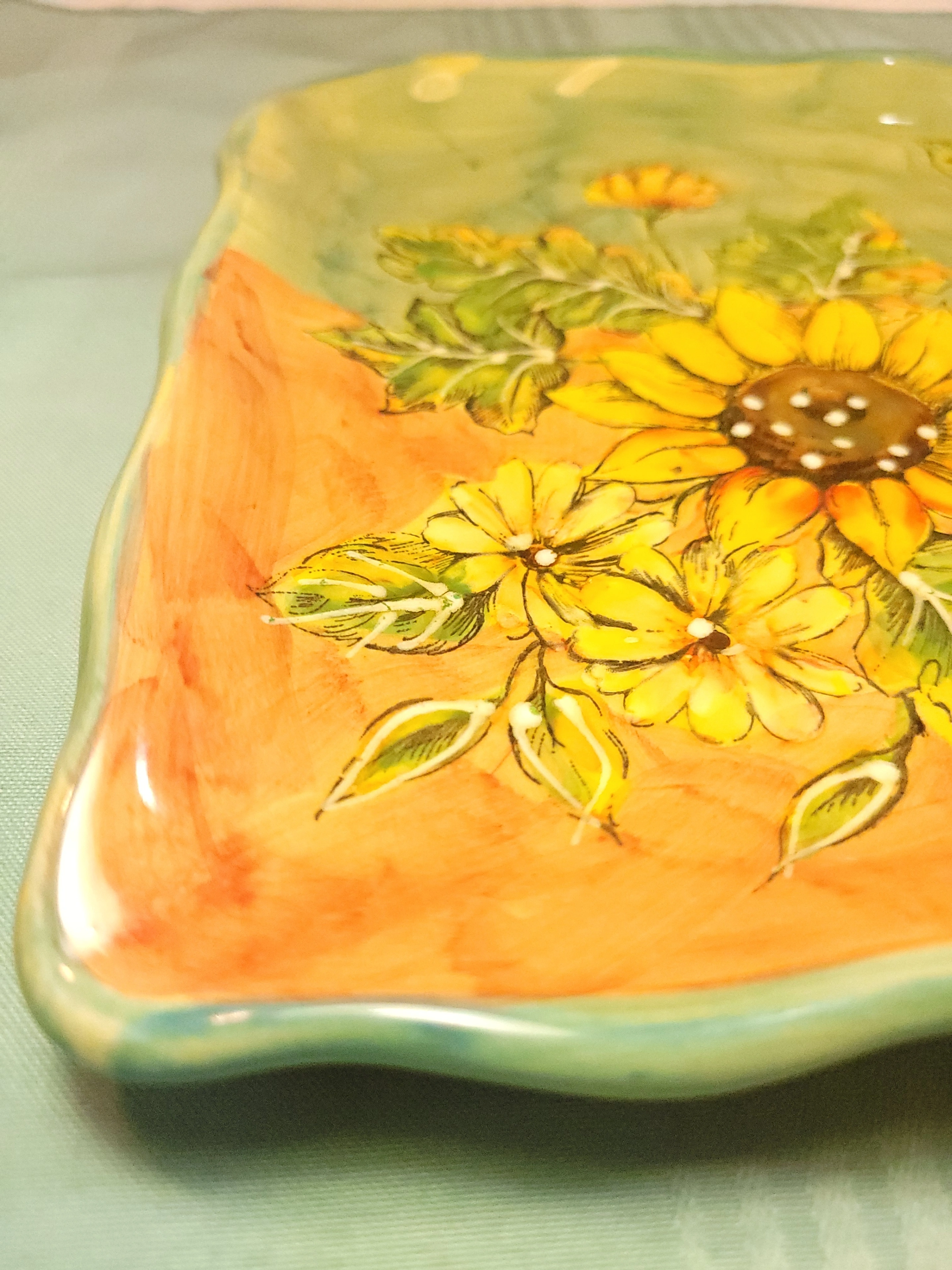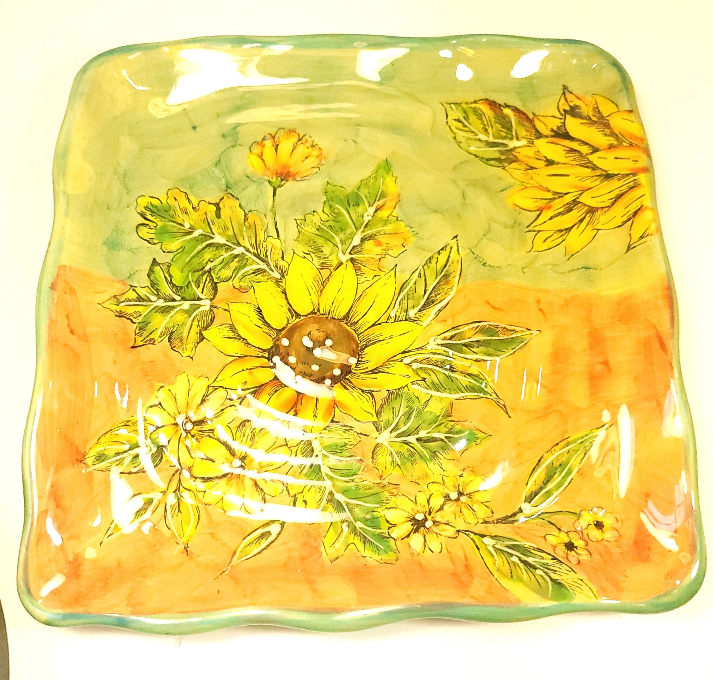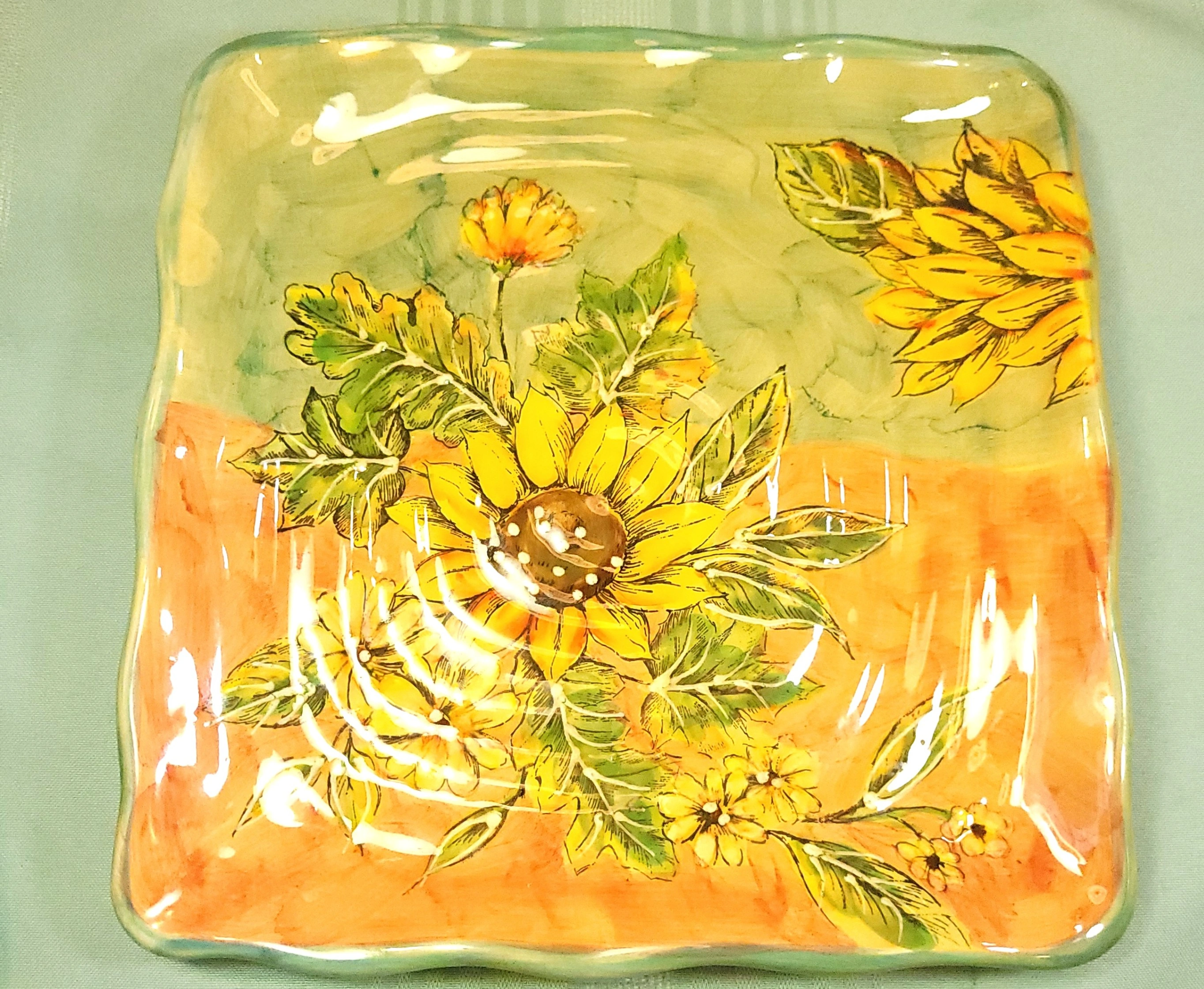 Hand Painted Sunflower Ceramic Square Plate, Circa 2001