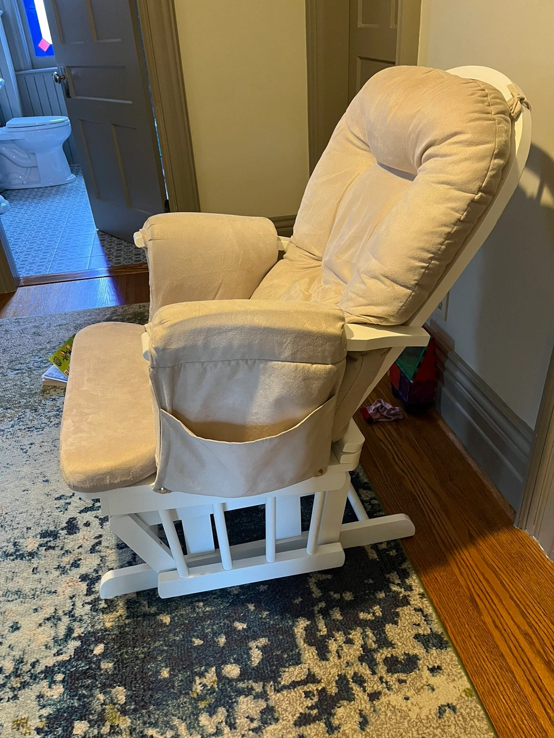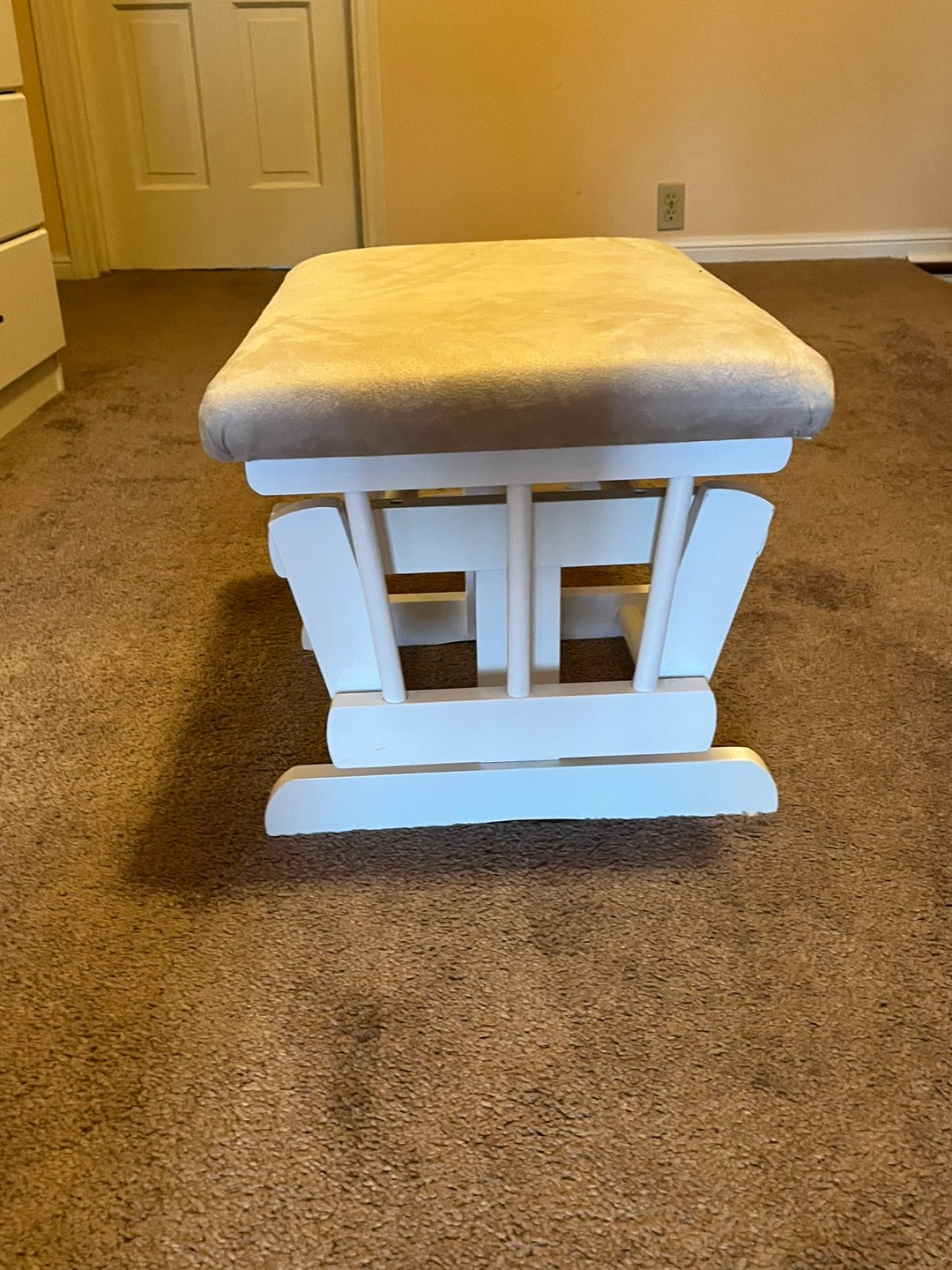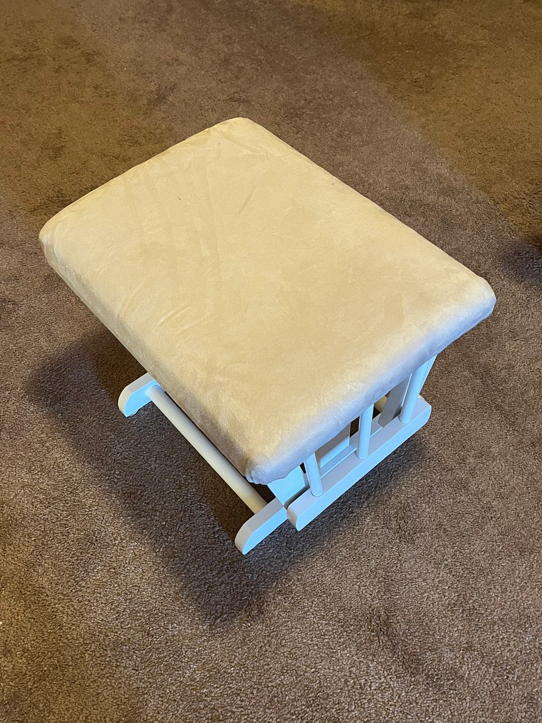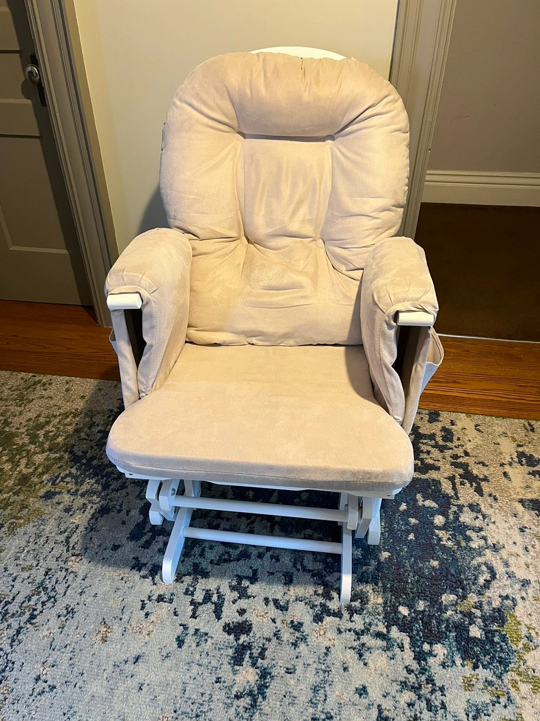 Gliding rocking chair and footrest with removable cushions. Both chair and footrest can rock. Back angle of chair is also adjustable. Perfect for nursing/rocking a baby. Both in very good condition.