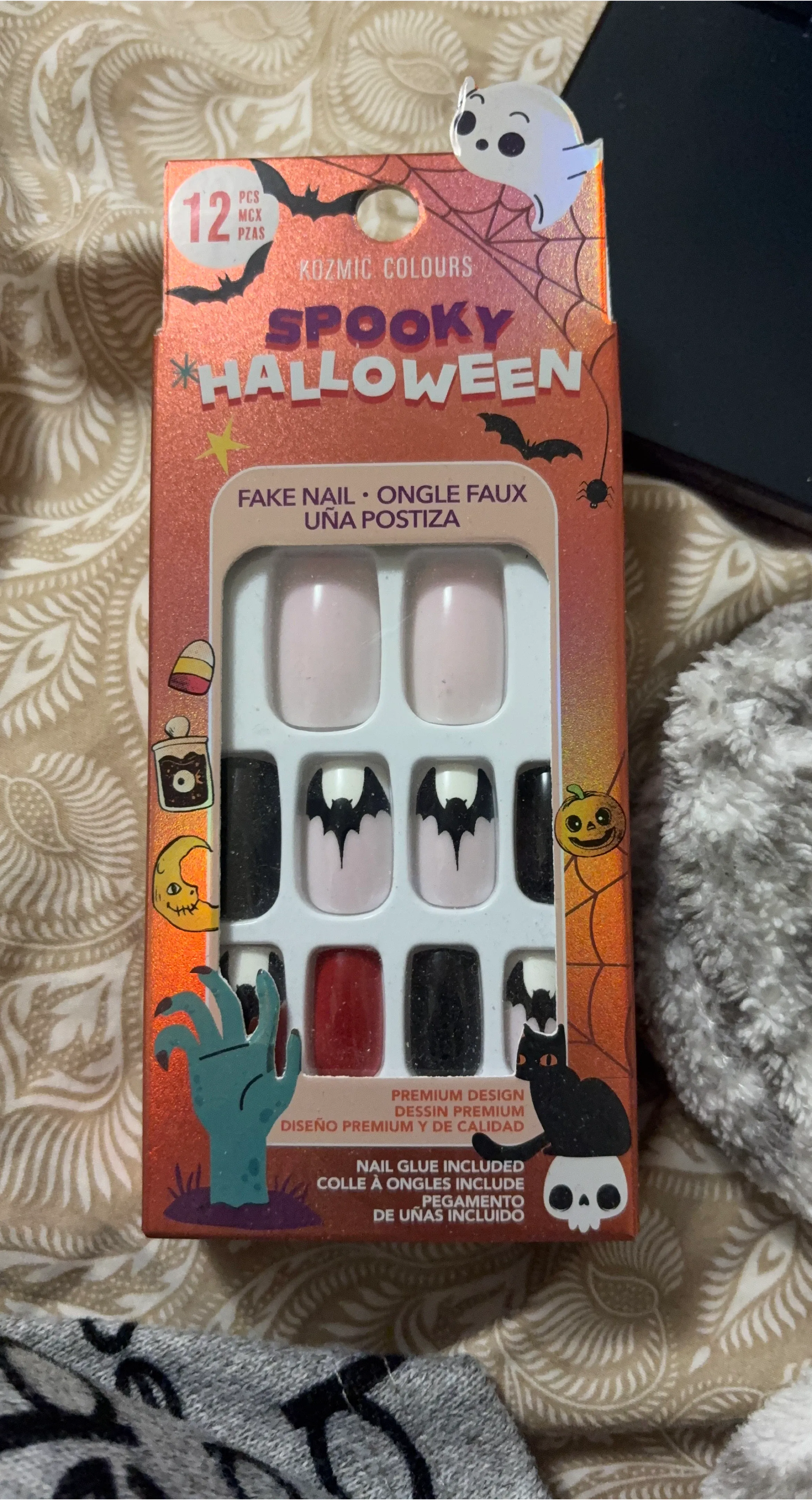 Kozmic Colours Spooky Halloween fake nails set. Includes 12 pieces and nail glue. Perfect for Halloween parties!