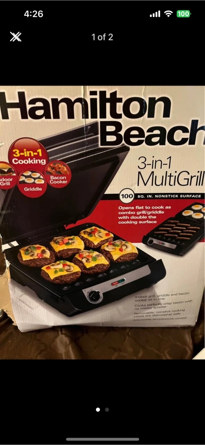 Selling a Hamilton Beach 3-in-1 MultiGrill! It's an indoor grill, griddle, and bacon cooker all in one. It features a 100 sq. in. nonstick surface that opens flat to cook as a large open griddle with double the cooking surface. It also has removable, nonstick cooking plates for easy cleaning!