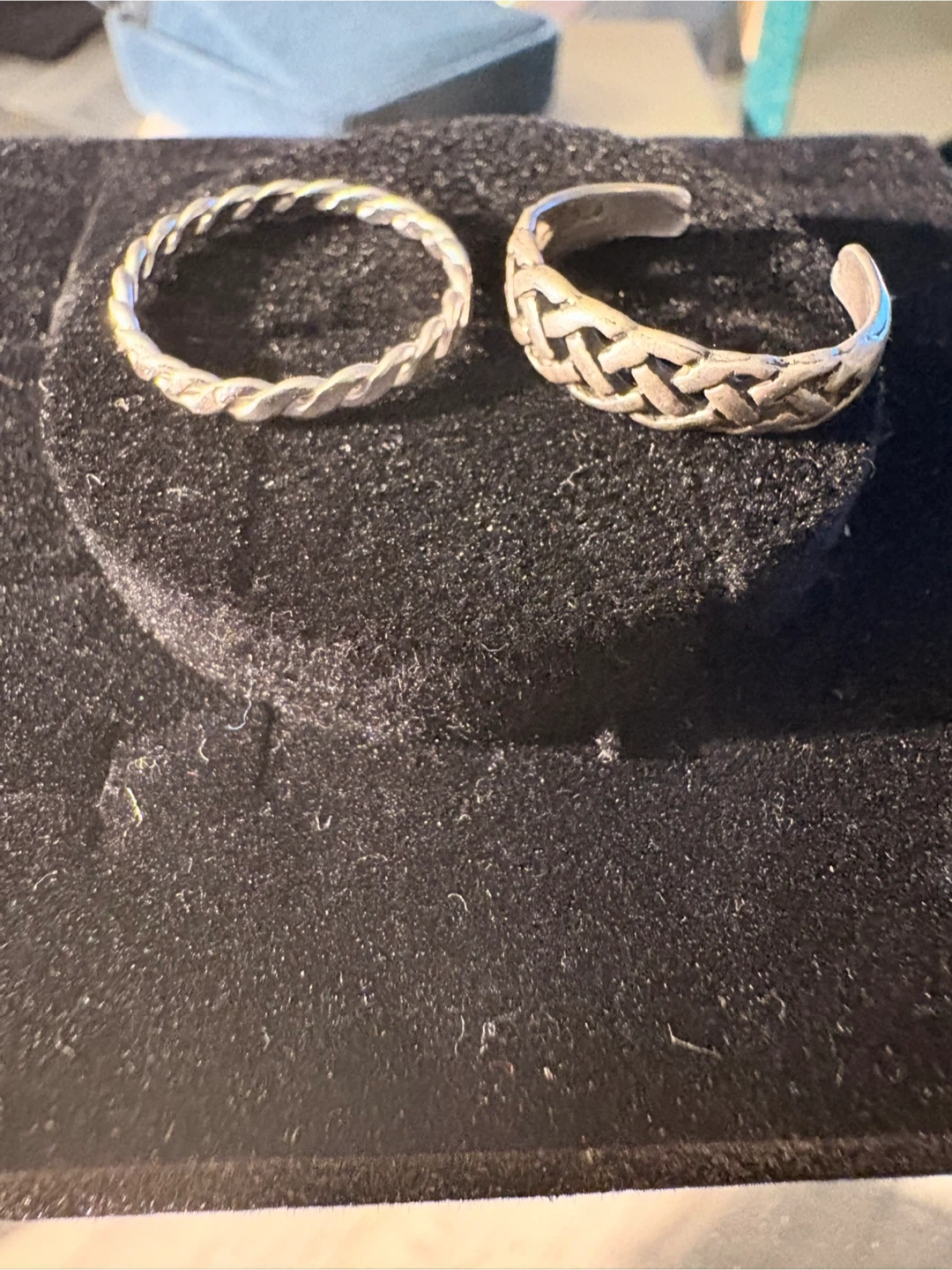 A braided sterling silver ring and a woven sterling silver ring. Both are stamped with .925. These rings add a touch of classic style to any outfit.size 5 and 6