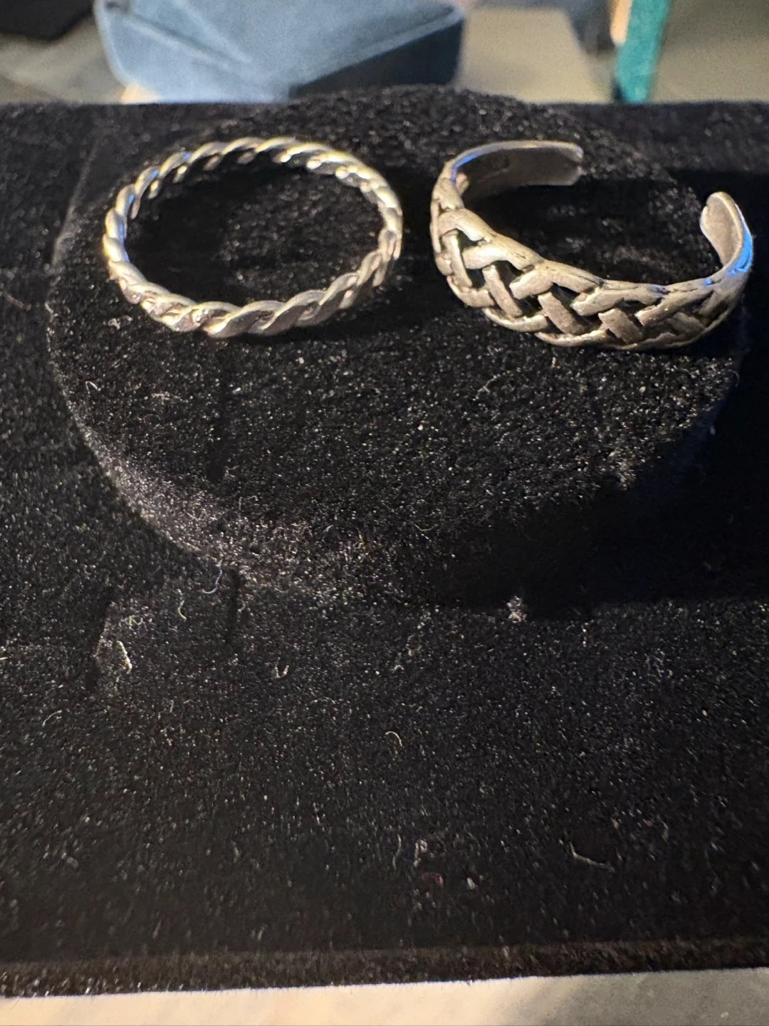 A braided sterling silver ring and a woven sterling silver ring. Both are stamped with .925. These rings add a touch of classic style to any outfit.size 5 and 6