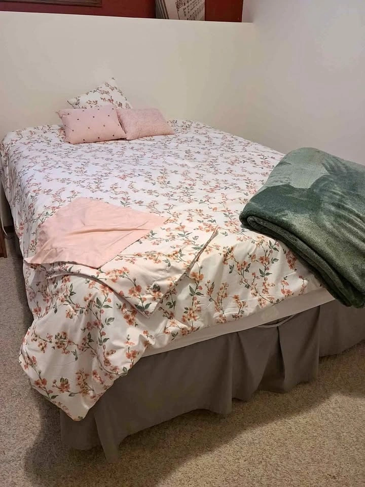 Bought for my senior mom in February. She was moved into a lodge in June and no longer has a queen bed. Really pretty soft fresh pattern of rose pink and green. Soft throw blanket sold separately if interested. It is also a queen size.