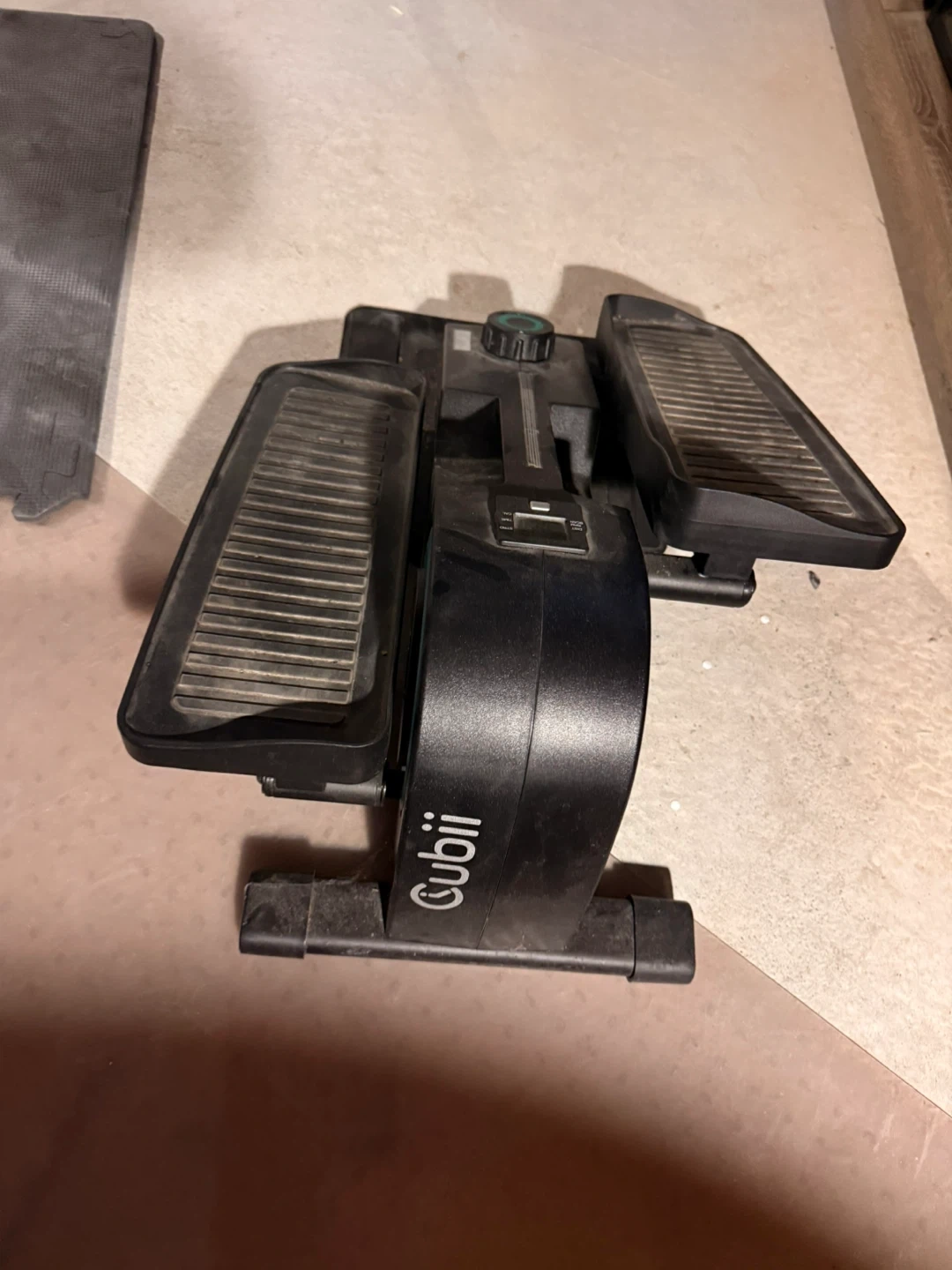 This is a Gubii compact elliptical, designed for under-desk use. It's black and includes a digital display to track your workout. It has adjustable resistance for a customized workout.