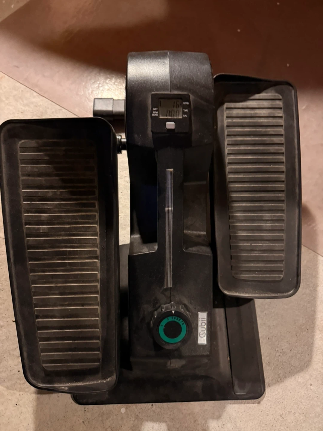 This is a Gubii compact elliptical, designed for under-desk use. It's black and includes a digital display to track your workout. It has adjustable resistance for a customized workout.