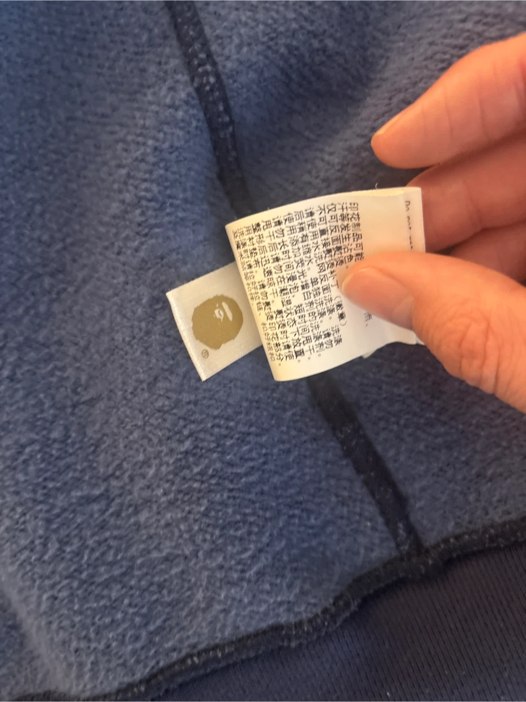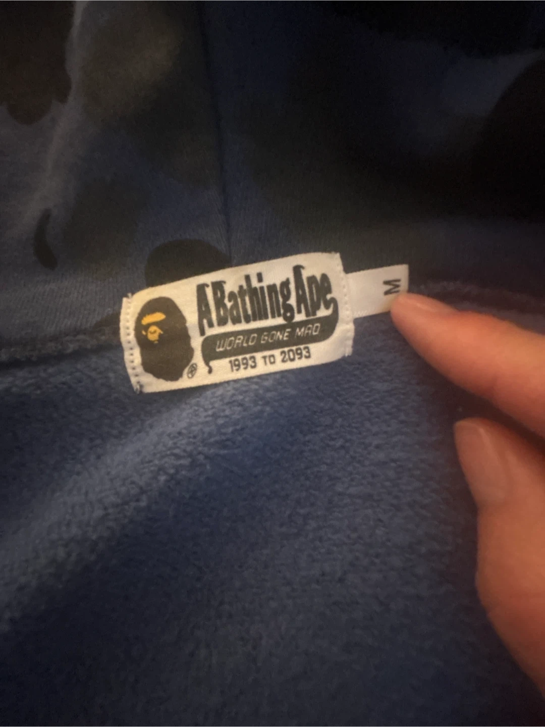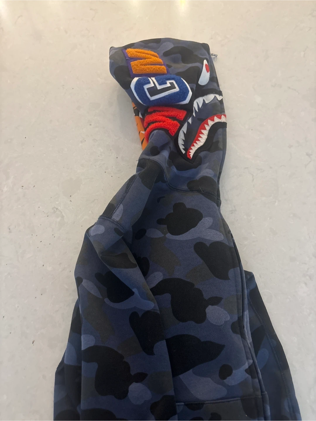 This is a blue camouflage full-zip hoodie from A Bathing Ape. It features the iconic shark graphic on the hood. Size medium. Cotton material.