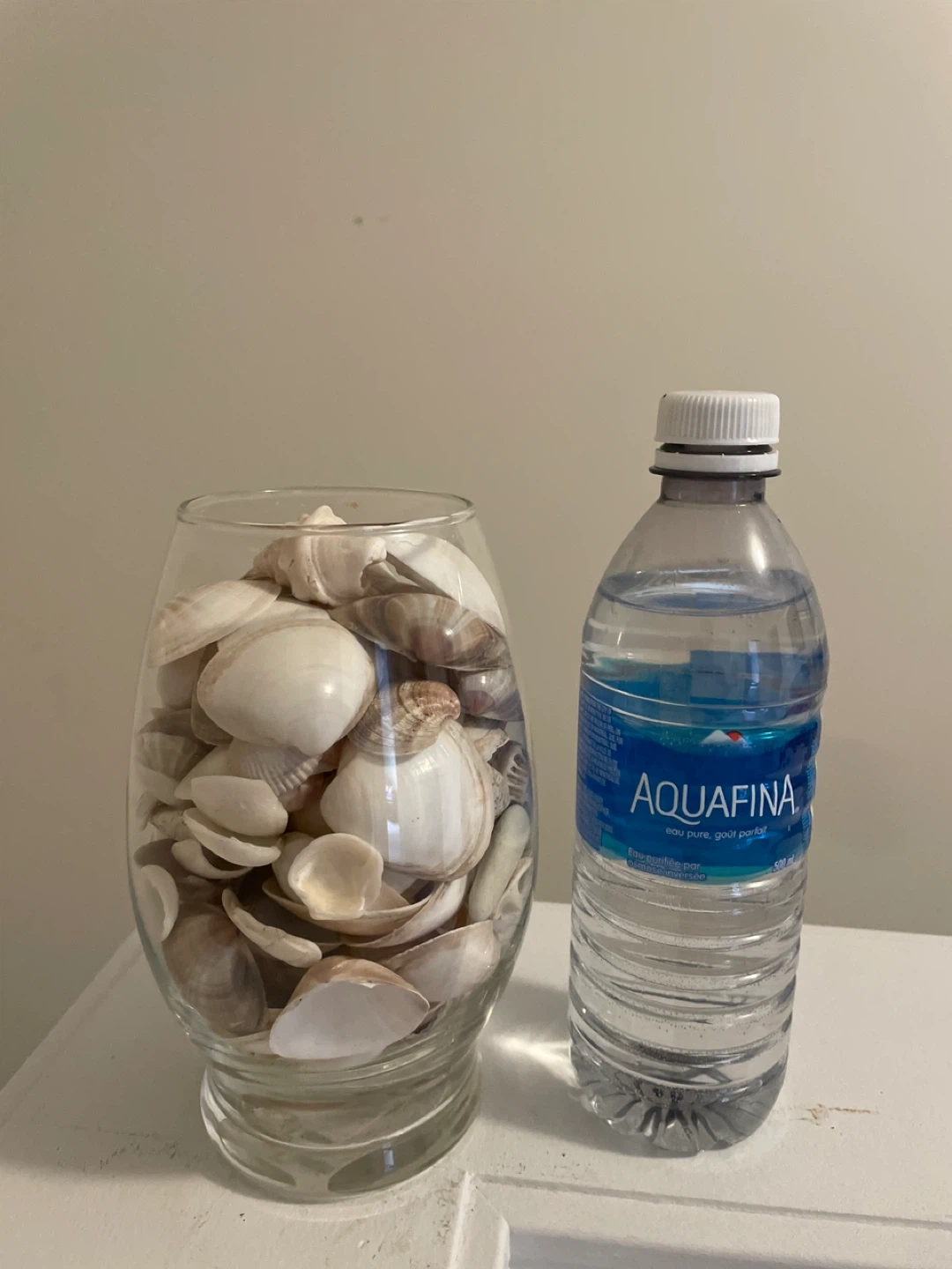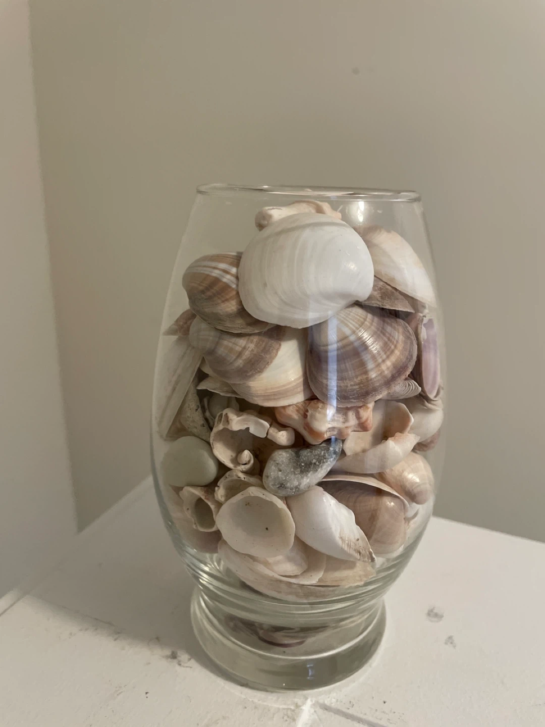 A lovely assortment of natural seashells fills a clear glass vase. Adds a touch of the coast to any room!
