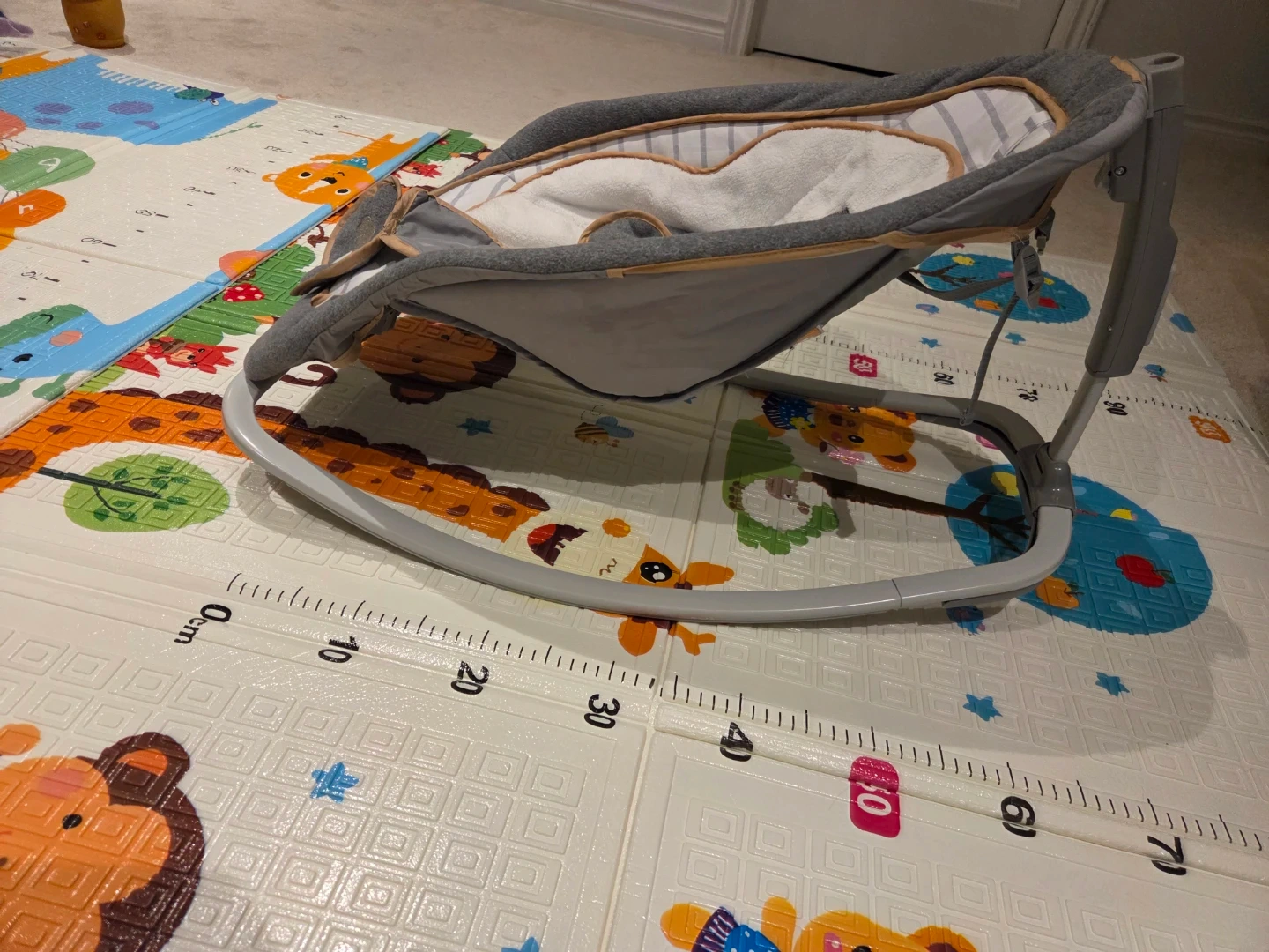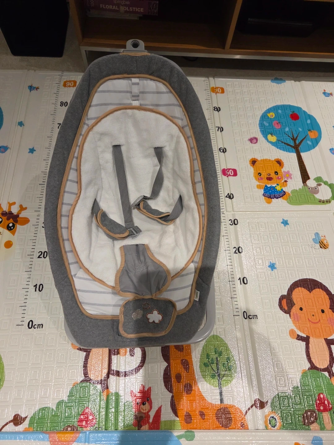 Grey and white striped baby rocker with a soft padded seat and safety straps. It has a metal frame for stability. Perfect for soothing your little one.