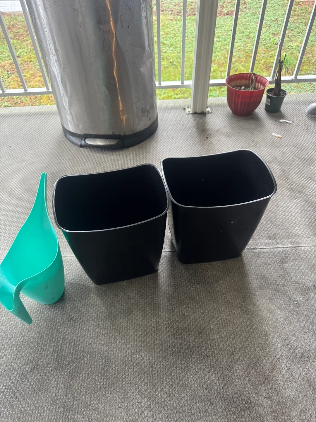 Two black plastic waste bins with a silver trim around the top. They're perfect for organizing small spaces. Dimensions are approximately 12" tall and 10" wide.