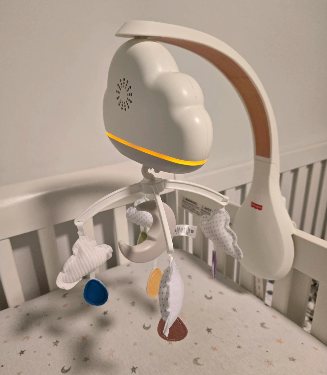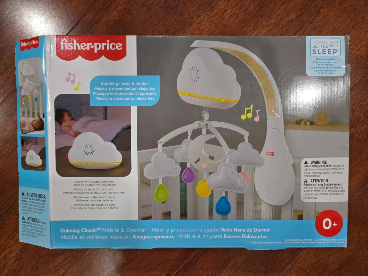 This Fisher-Price Calming Clouds Mobile & Soother plays soothing music and motion. It features a tabletop soother with a light and sound detection function. Suitable for 0-5 months.