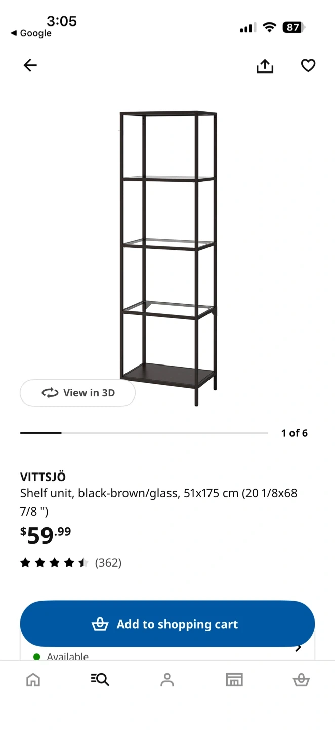 This is an IKEA VITTSJÖ shelf unit. It's black-brown with glass shelves. It measures 51x175 cm (20 1/8x68 7/8 "). This unit is great for storing books or displaying decor.