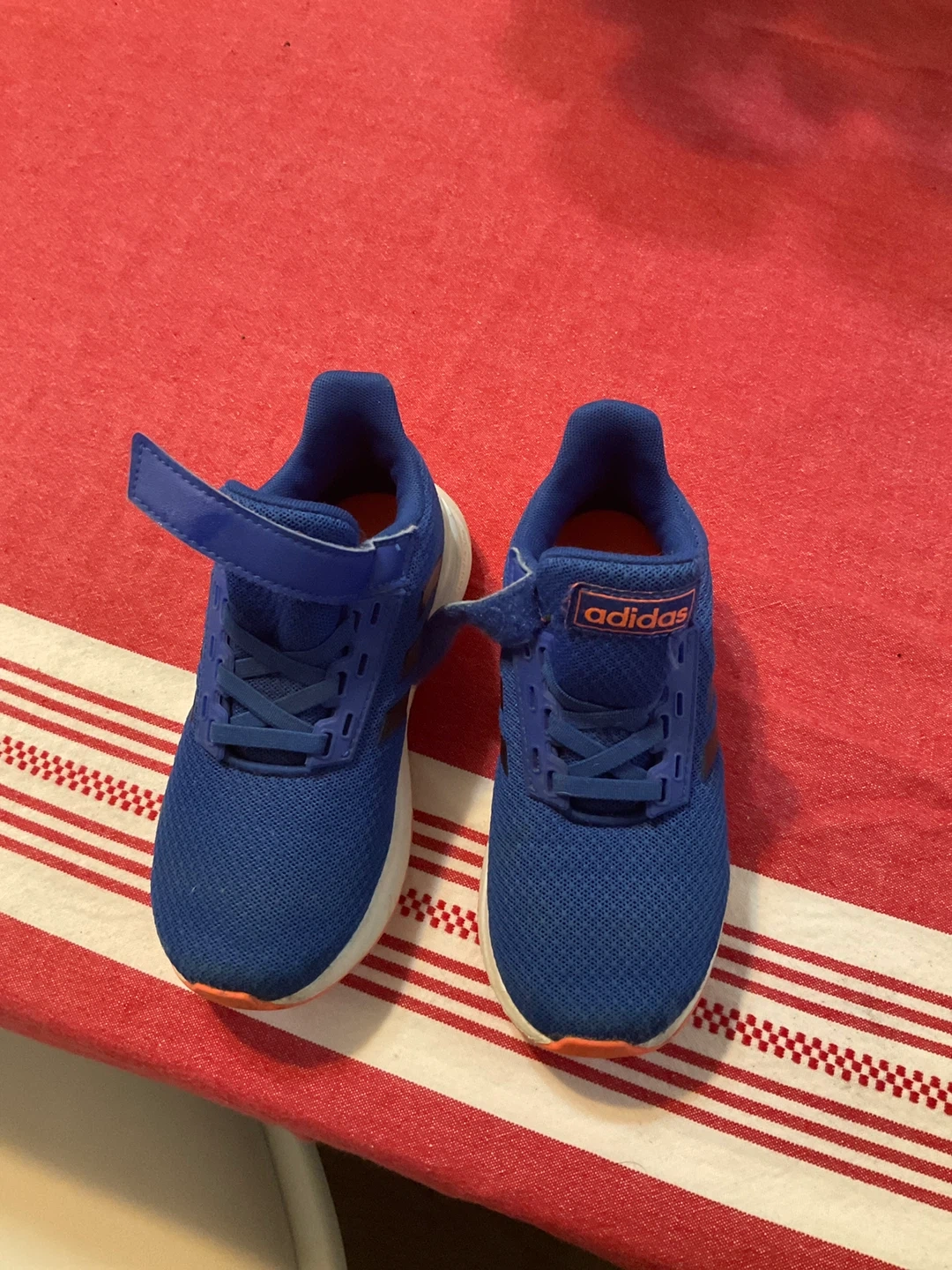 Blue Adidas running shoes for kids. They have velcro and lace closures for a secure fit. Great for everyday wear or sports! Size 11