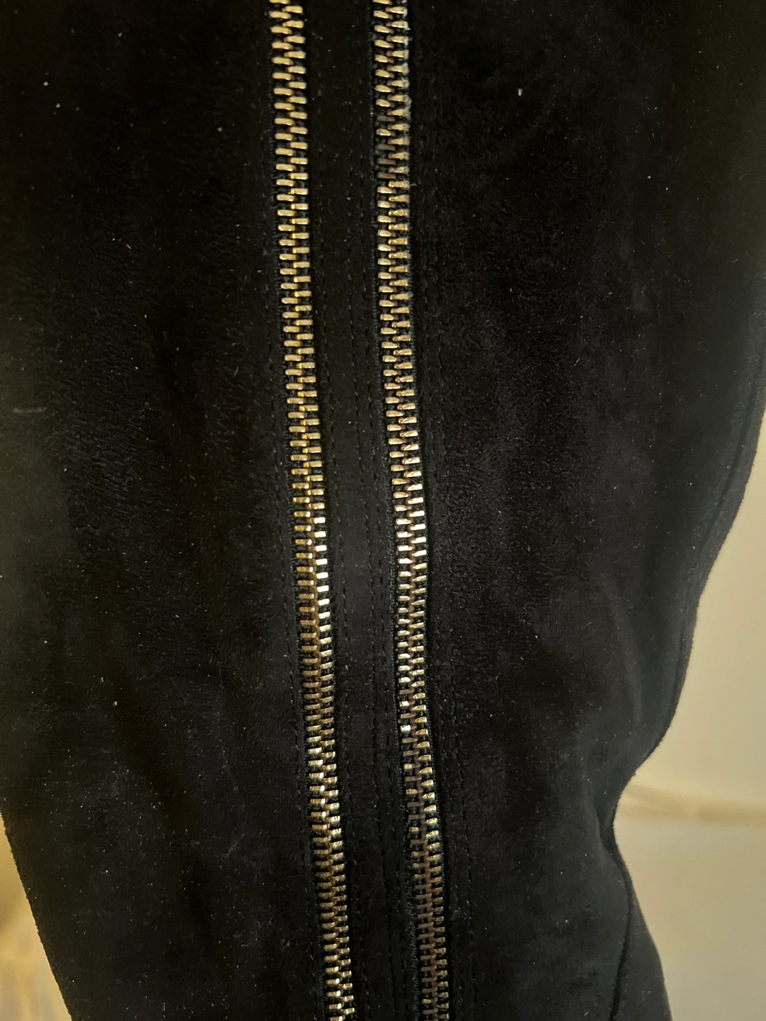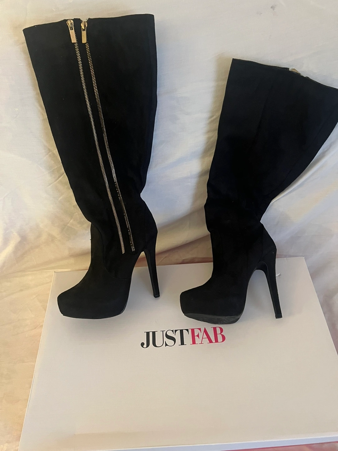 Black suede knee high boots with gold zippers. Platform heels.