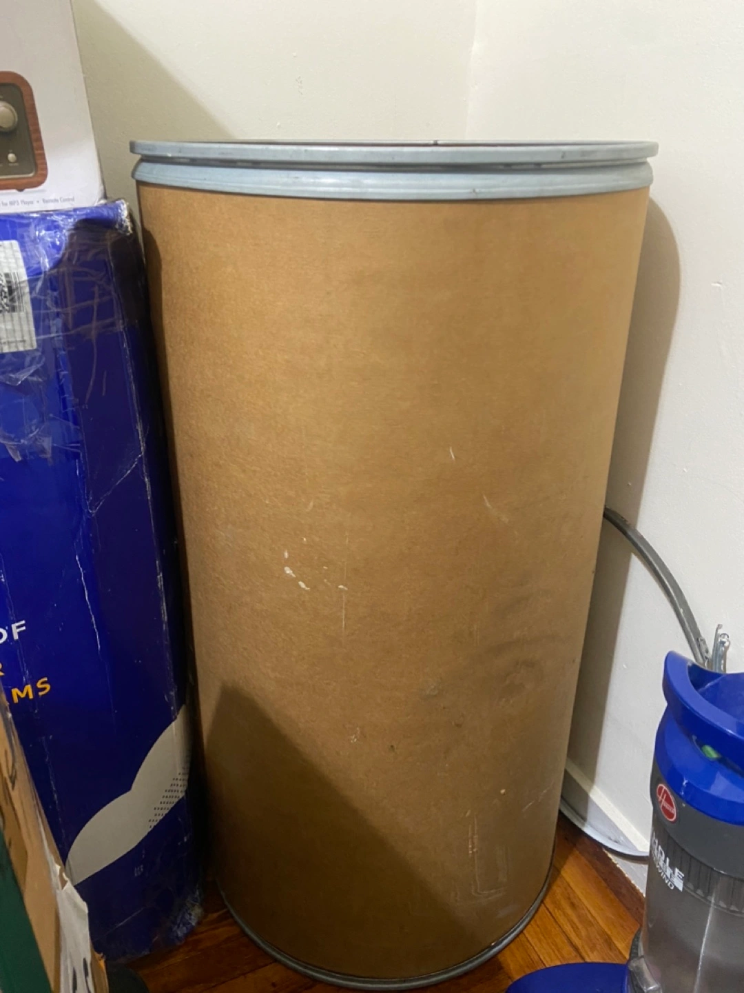 Selling a large cardboard drum container. It's sturdy and in good condition, perfect for storage or other uses! It's a brown color with grey edges.